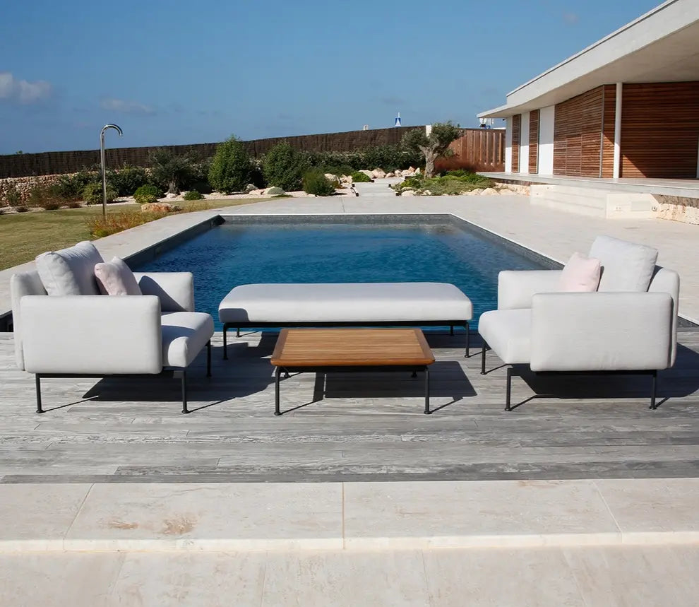 Low Profile Design: Streamlined silhouette creates open, inviting sightlines perfect for modern outdoor conversation areas. Neutral Frame Options: Arctic White for bright coastal settings or Forge Grey for sophisticated urban patios.