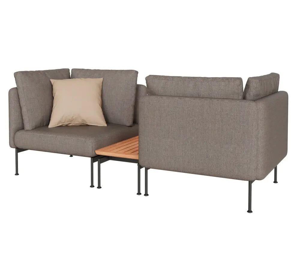 Shared Central Table: Teak table surface between seats eliminates need for separate coffee tables. Two-Seat High Arm Configuration: Self-contained 261x90cm unit with commanding presence ready for immediate outdoor deployment.