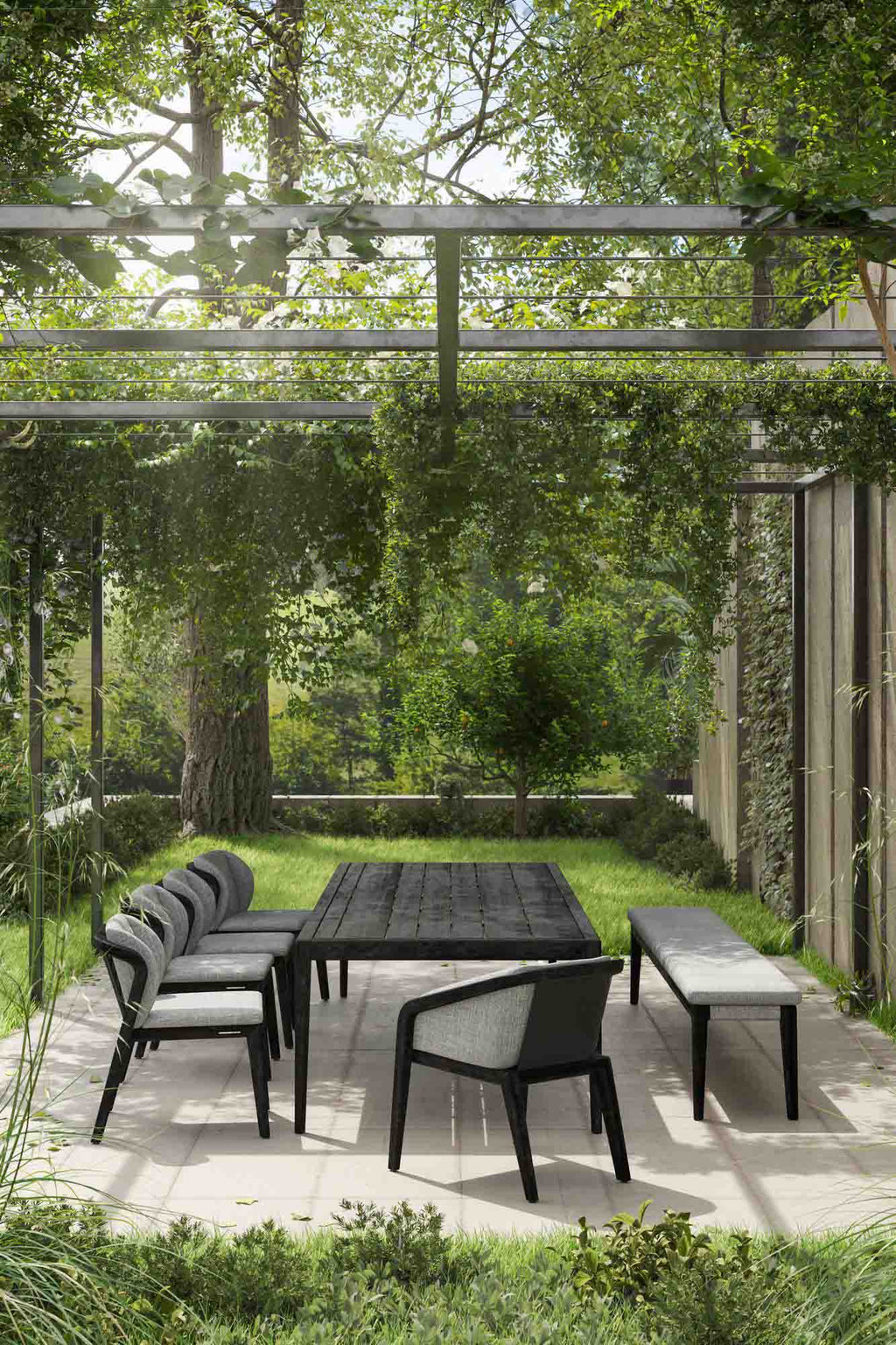 Contemporary Boldness with Armrest Elegance: The luxurious matt black Teak Scuro finish, where natural wood grain remains visible, combines with sleek black Batyline® textile and refined armrests for a striking modern aesthetic. This eco-friendly oil-based treatment nourishes and protects the wood while creating an avant-garde statement perfect for upscale commercial and residential outdoor dining spaces.
