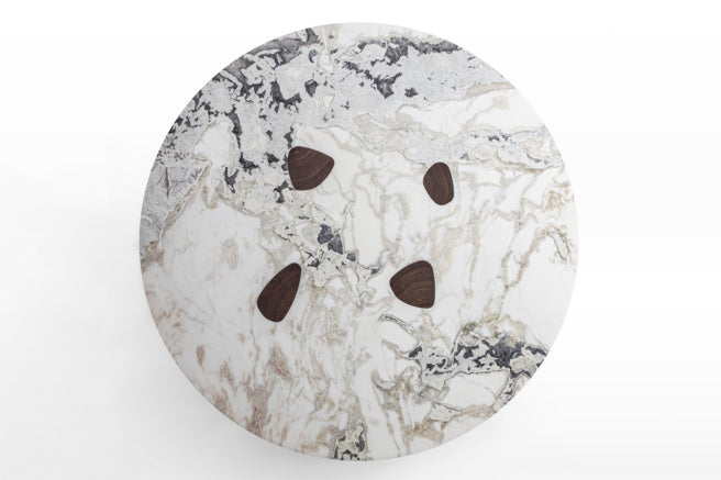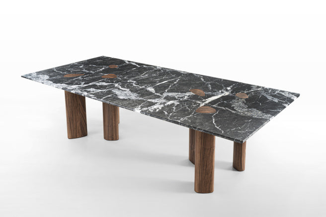 Patrick Jouin Design: Created by renowned designer Patrick Jouin, the Oswood merges sculptural marble tops with warm solid walnut wood legs for a truly elegant table.