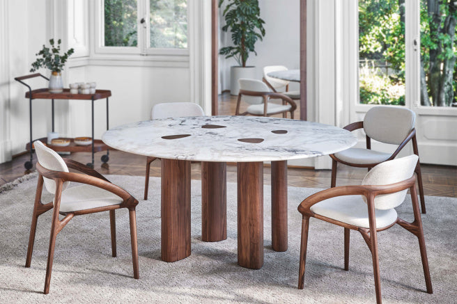 The Porada Oswood Marble Dining Table, designed by Patrick Jouin, seamlessly combines luxurious marble tops with solid canaletta walnut legs. Available in both round and rectangular configurations, the Oswood table features elegant marble surfaces with wooden inserts matching the walnut legs, precisely positioned beneath each leg to create a refined, harmonious design.