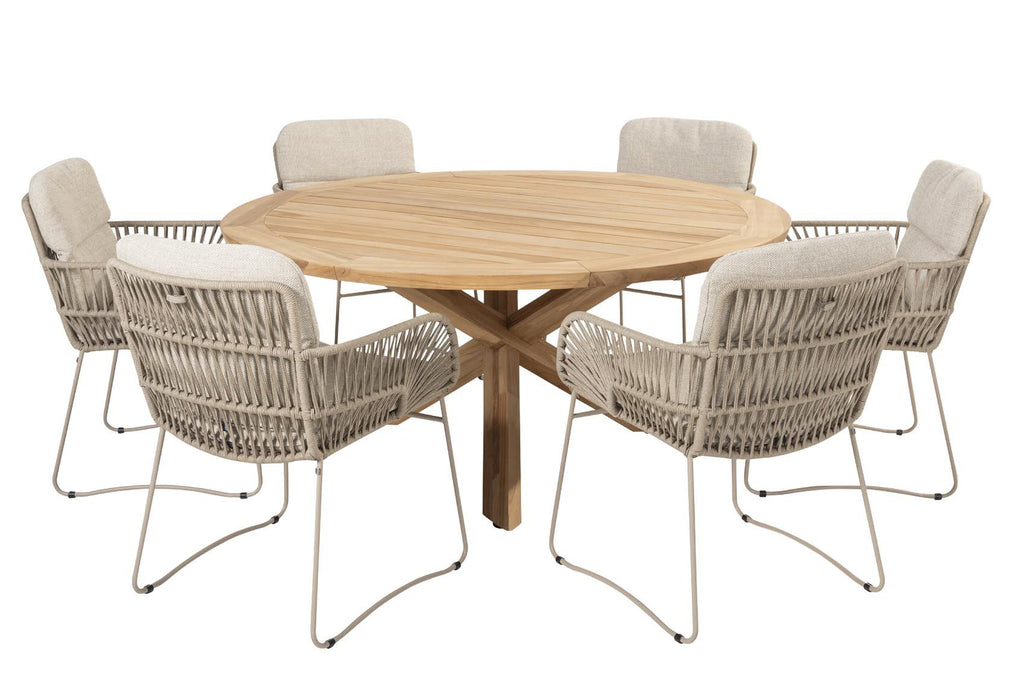 Upgrade your outdoor dining experience with the 4 Seasons Outdoor Murcia Dining Set with Prado 160cm Round Teak Table. This premium, brand new collection includes six Murcia Dining Chairs in Latte with supportive, weather-resistant cushions and a beautifully crafted Prado Round Dining Table made from natural teak. Perfect for those who seek modern luxury and long-lasting comfort in one elegant package.