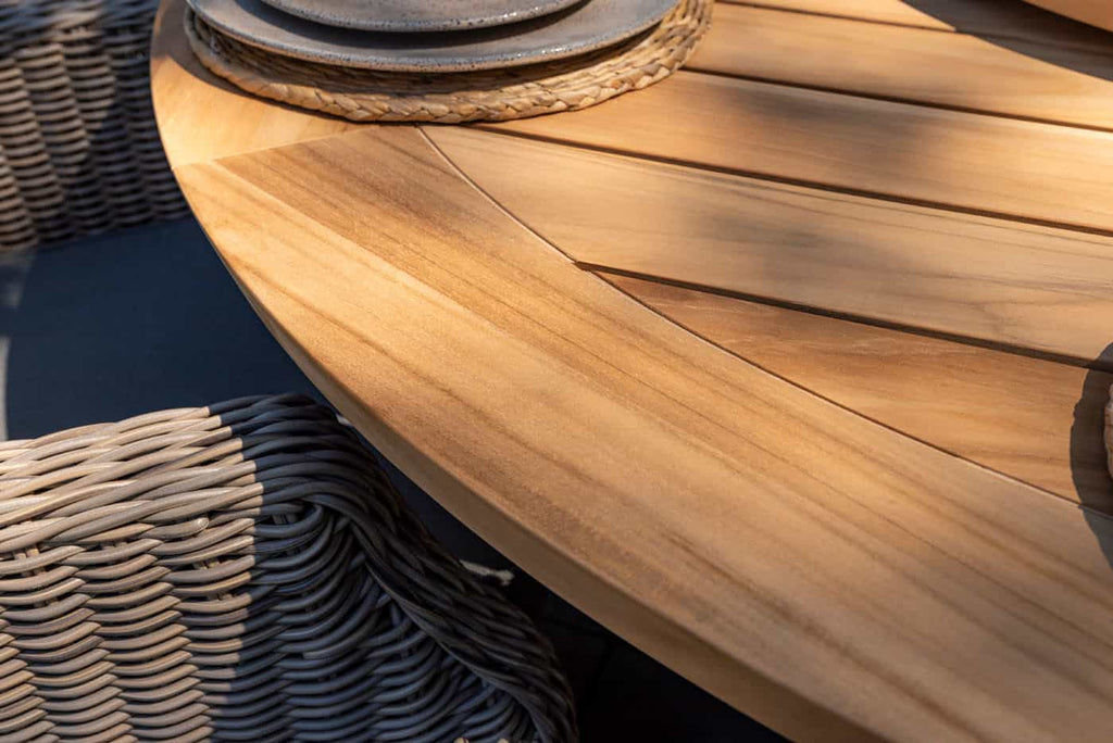 - Premium Teak Table: The Prado round tabletop delivers natural beauty and refined design, supported by bold, modern legs for contemporary appeal.