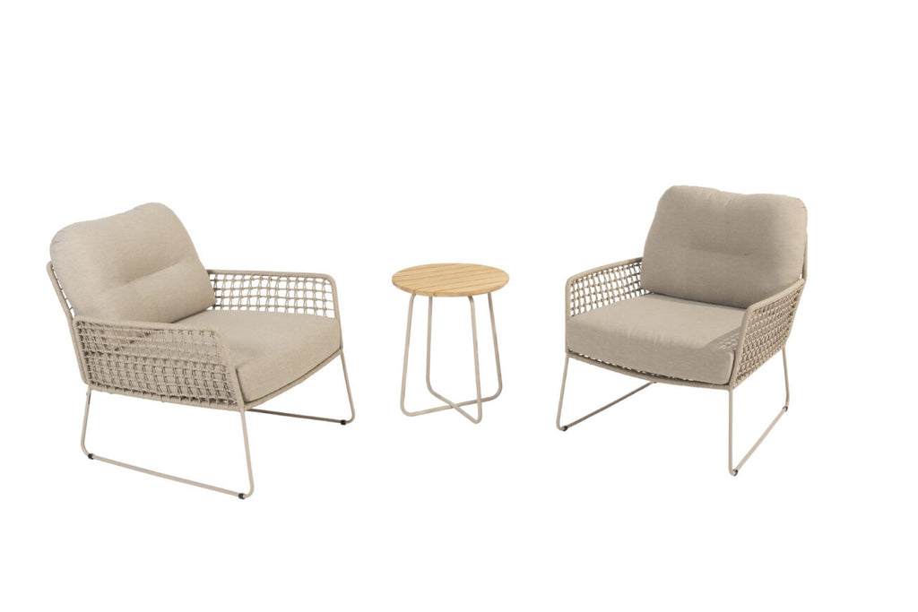 The Albano Lounge Set from Taste by 4 Seasons Outdoor blends minimalist charm with everyday comfort. Featuring two lounge chairs in a soft latte finish and a matching teak side table, this compact and contemporary set is ideal for small outdoor spaces, balconies, or indoor sunrooms. Its modern woven frame and plush cushions offer a stylish yet relaxed setting for your leisure moments.