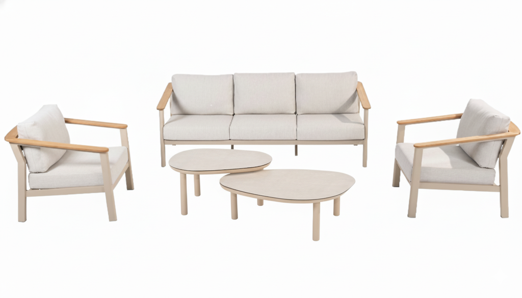 The 4 Seasons Outdoor Olivia Lounge with Monroe Coffee Tables brings refined outdoor living to your garden, terrace, or patio. Crafted with powder-coated aluminium and steel frames in a warm latte finish, and complemented by soft Solefin cushions in white and taupe, this lounge set blends contemporary design with exceptional outdoor durability. The two Monroe Coffee Tables—featuring elegant printed ceramic glass tops in coordinated latte tones—complete the ensemble with modern sophistication and practicality.