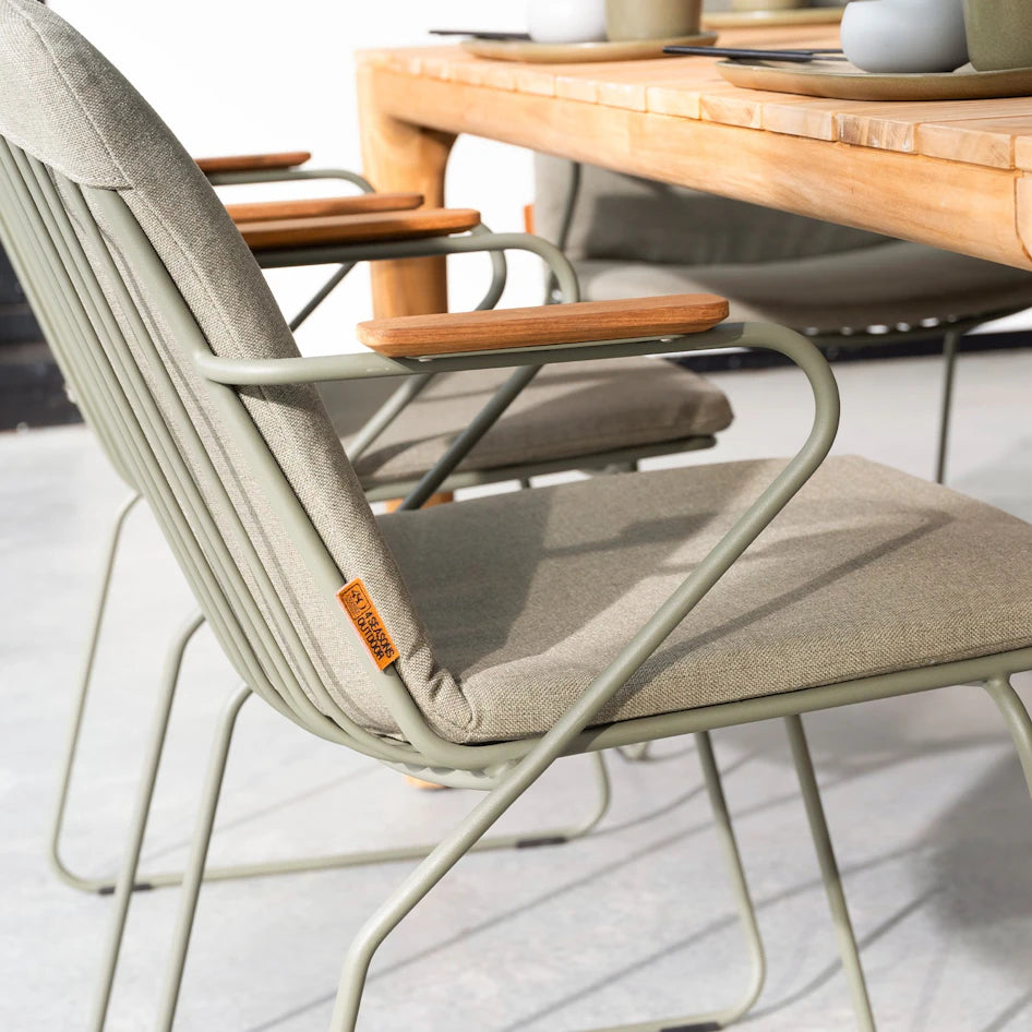 The Veneto Dining Chair brings a sleek, contemporary edge to your outdoor dining area. Built with a robust RVS steel frame and complemented by elegant natural teak armrests, this chair delivers durability, style, and functionality in one modern package. The included cushion provides added comfort, while the stackable design ensures effortless storage when not in use.
