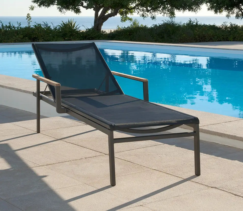 - Triple Premium Finish Combinations: Graphite frame + Charcoal sling OR Arctic White frame + Pearl sling OR Champagne frame + Titanium sling — all with natural teak armrests.