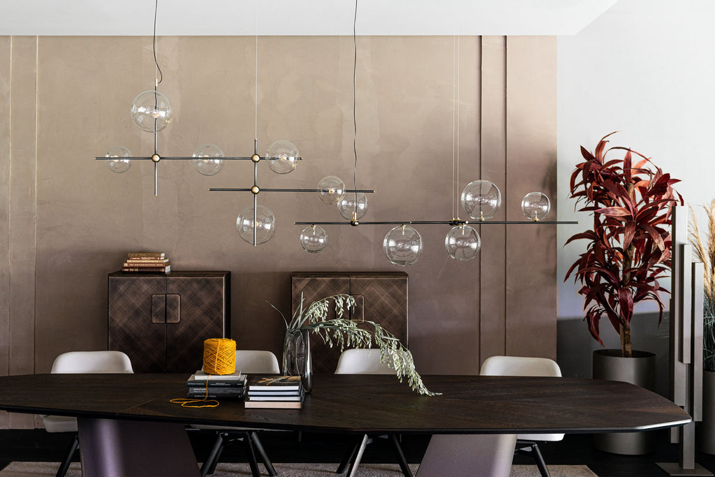 The Cattelan Italia Bloom Chandelier is a poetic modern light fixture inspired by nature’s organic growth. Designed as a delicate cluster of slender metallic branches, Bloom "blooms" into six large transparent crystal spheres, sparkling like ripe fruit under sunlight. With brushed brass connectors that double as decorative accents, this elegant chandelier brings a touch of refined Italian craftsmanship to contemporary interiors. For added versatility, multiple Bloom chandeliers can be combined to create a modular, repeating composition.