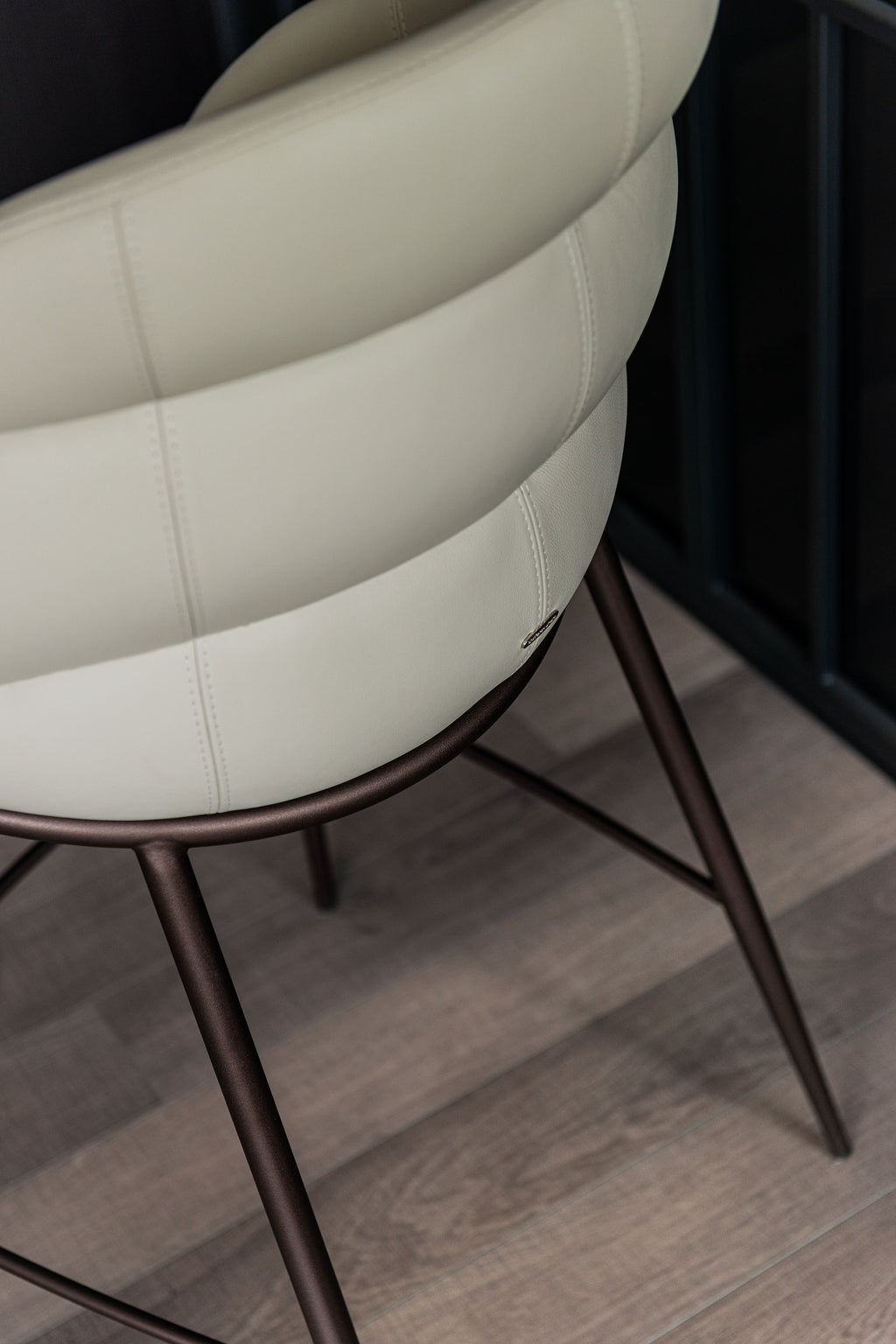 The Camilla ML stool, designed in 2024, is a sculptural expression of contemporary comfort and style for dining and social spaces. Characterized by sinuous, ergonomic lines, its enveloping backrest and upholstered arms deliver both distinguished aesthetics and inviting postural support. The distinctive horizontal stitching forms three plush projections on the back, finishing smoothly into the armrests, while the lower curved frame offers notable softness and a sense of embrace. Camilla’s ML (metal leg) version is lighter, more maneuverable, and perfectly balanced between a spacious seat and slender, elegant legs—making it ideal for sophisticated kitchens, bars, and contract interiors.