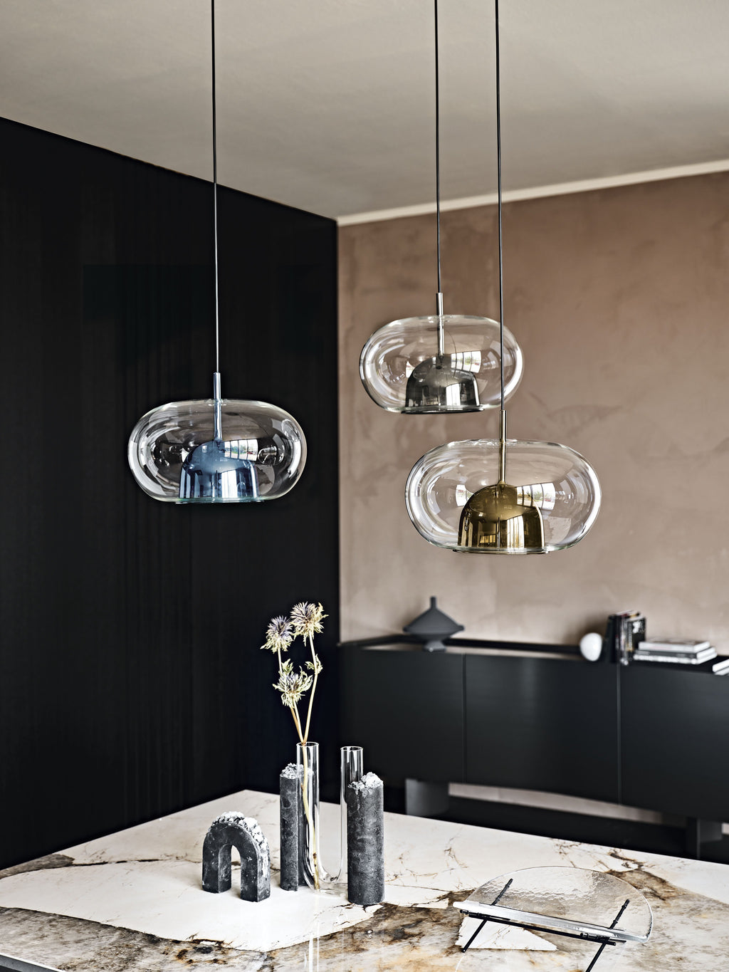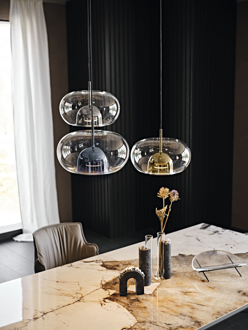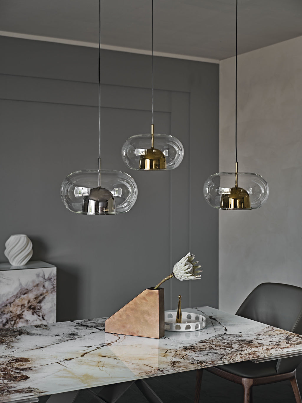 The Cattelan Italia Coimbra Ceiling Lamp brings harmony and visual lightness to any contemporary interior. This elegant suspended lamp features a clear borosilicate glass sphere gently flattened at the center, which houses a contrasting painted inner bell available in bronze, dark grey, or light blue. Whether displayed individually or arranged in an asymmetrical cluster, Coimbra softly enhances dining spaces, living rooms, or reading corners with its warm, diffused glow and sculptural beauty—even when turned off.
