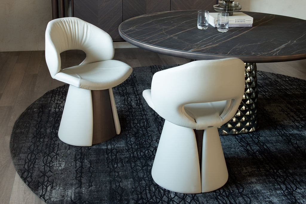 The Dafne Chair by Cattelan Italia is a sculptural, royalty-inspired armchair designed by CS LAB. Characterized by its unique polygonal seat and back—modeled like two elegant shells with gentle curves and a striking elliptical cavity—Dafne brings a regal presence to modern dining rooms. Rich bespoke details such as a perforated backrest, cloak-like upholstery, and a refined, cone-shaped base finished with a metal breastplate, elevate this chair as the hallmark of premium Italian design and comfort.