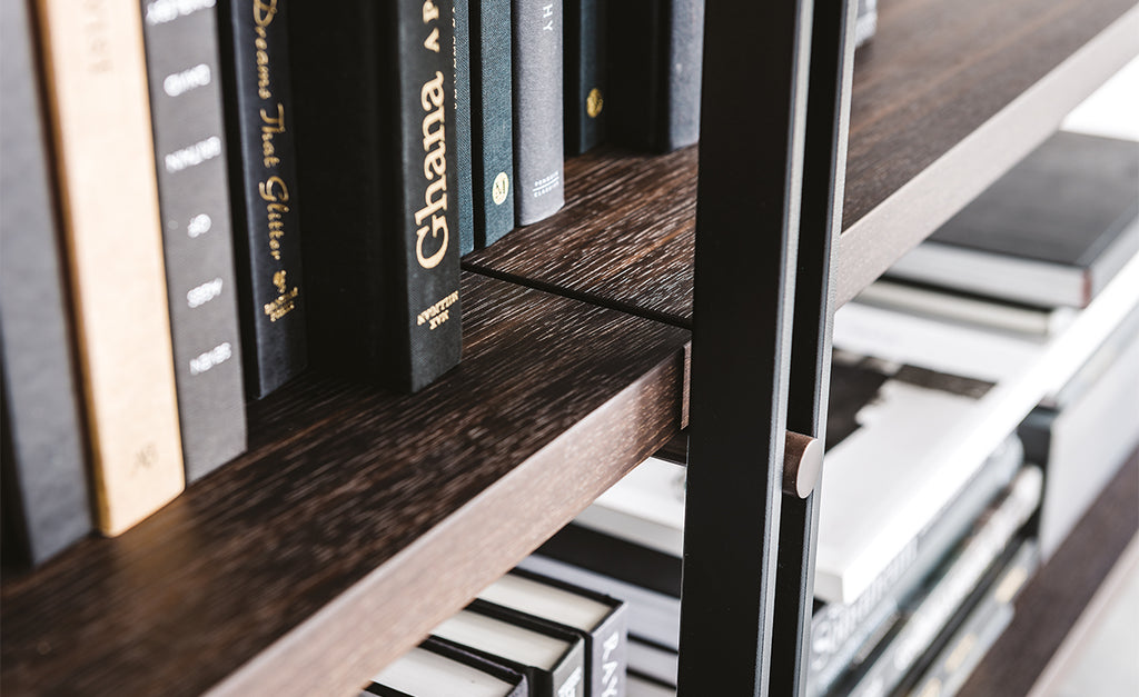 The Hudson bookcase stands out with its modular, cage-like design assembled from vertical embossed steel strips. This structure allows for highly customizable configurations, with multiple modules able to be combined side by side or used as an eye-catching open-space room divider. The refined contrast between the lacquered steel frame and the shelves—crafted in either Canaletto walnut or burned oak—delivers modern elegance and flexibility tailored to both living and working spaces.