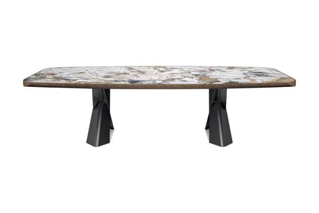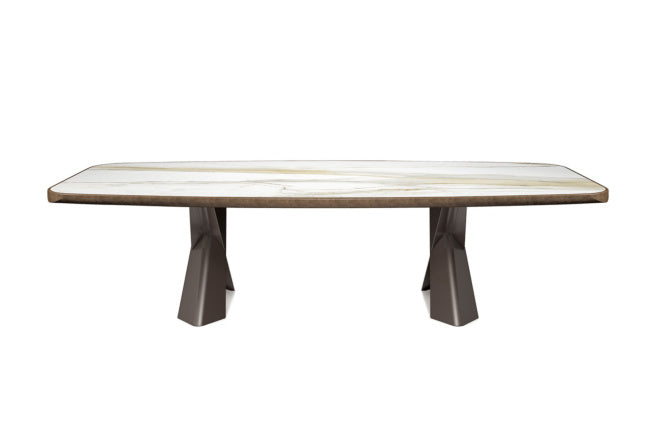 The Cattelan Italia Mad Max Keramik Premium Barrel-Shaped Dining Table redefines bold dining design through an extraordinary fusion of power and refinement. With its gracefully curved ceramic surface and luxurious real metal edge, this premium edition elevates the iconic Mad Max silhouette to unprecedented heights of sophistication. Whether you choose the 240×120 or 300×128 cm version, the Mad Max Premium is a commanding centerpiece for dining rooms that demand dramatic presence and exceptional Italian craftsmanship. The curved ceramic top is offered in an exquisite array of matte and glossy finishes that replicate the veining and elegance of natural marble and precious stones, while the robust angular base reflects contemporary strength with its architectural dynamism. A brushed edge in Brushed Bronze or Brushed Grey surrounds the top, adding depth and metallic richness to its bold presentation. Designed to comfortably seat 10 to 12 guests, this is Italian design at its most powerful and graceful.