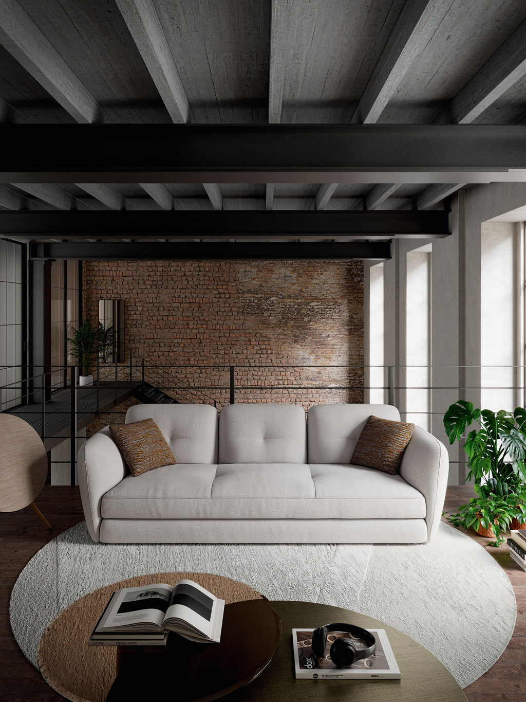 SC250 is the large semi-circular centerpiece “amphitheatre” for Michael modular compositions, providing a gently curved seating area for shared moments. The technical build includes a pine/conposite frame, multi-density polyurethane structure (18 + 25 + 40), elastic belts, featherproof polyester fiber, and stylish grosgrain piping.