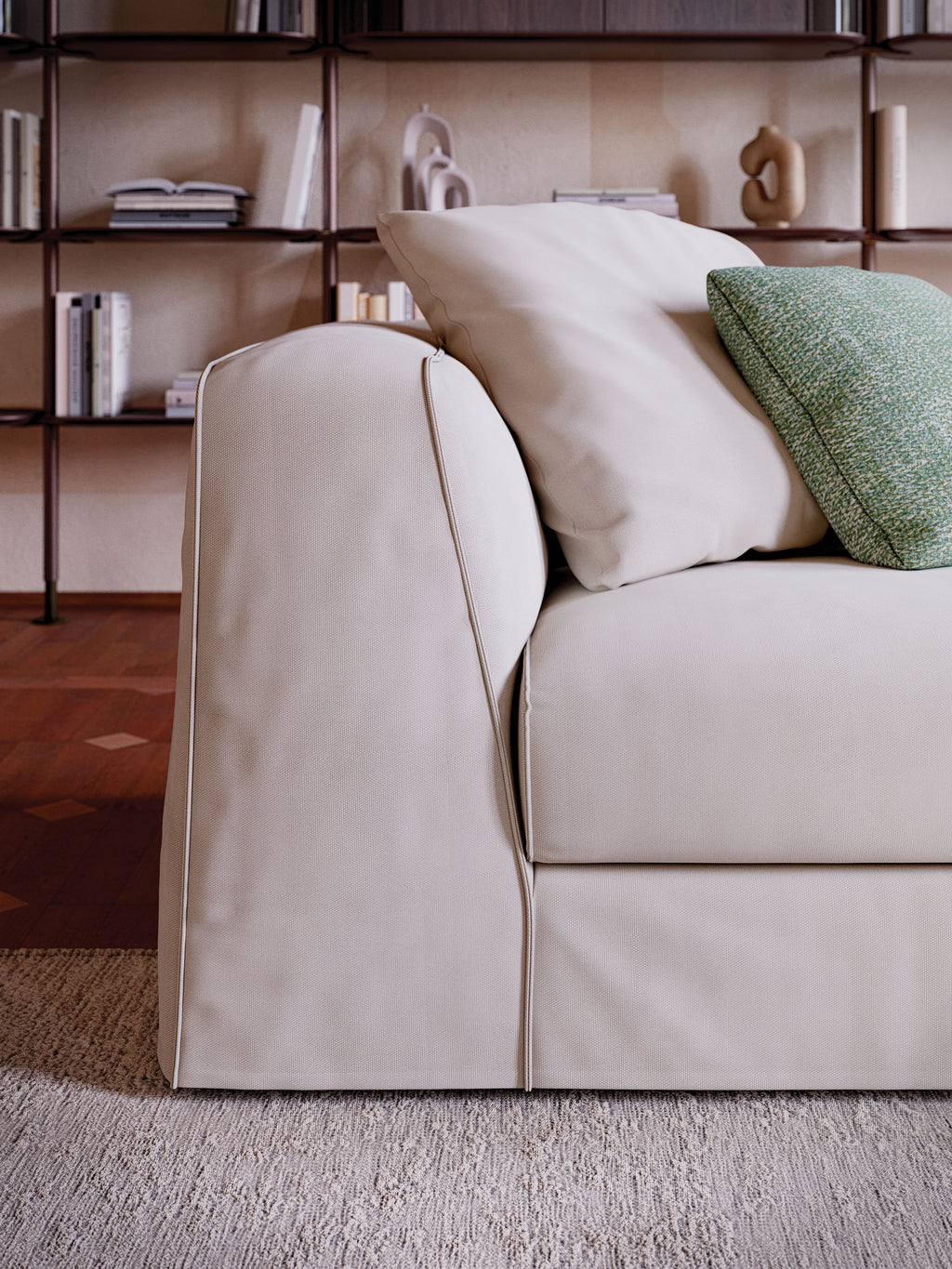 The Mykonos Collection by Cattelan Italia is a modern, sophisticated system of sofas, poufs, and cushions inspired by neoclassical Greek aesthetics. Designed to embody purity, harmony, and timeless elegance, the collection showcases a softly draped silhouette with refined tailoring, visible stitching, and discreet ABS thermoplastic feet. Comfort is at the core: deep seats and supportive backs are enhanced by multi-density padding, feather-blend cushions, and optional cylindrical headrests. Crafted for both contemporary and minimalist living, Mykonos combines versatile modular configurations with practical, changeable upholstery options, ensuring a balance of aesthetic appeal, relaxation, and functional flexibility. Both sofas and accessories are available in removable fabric or fixed leather coverings with premium Italian craftsmanship throughout.