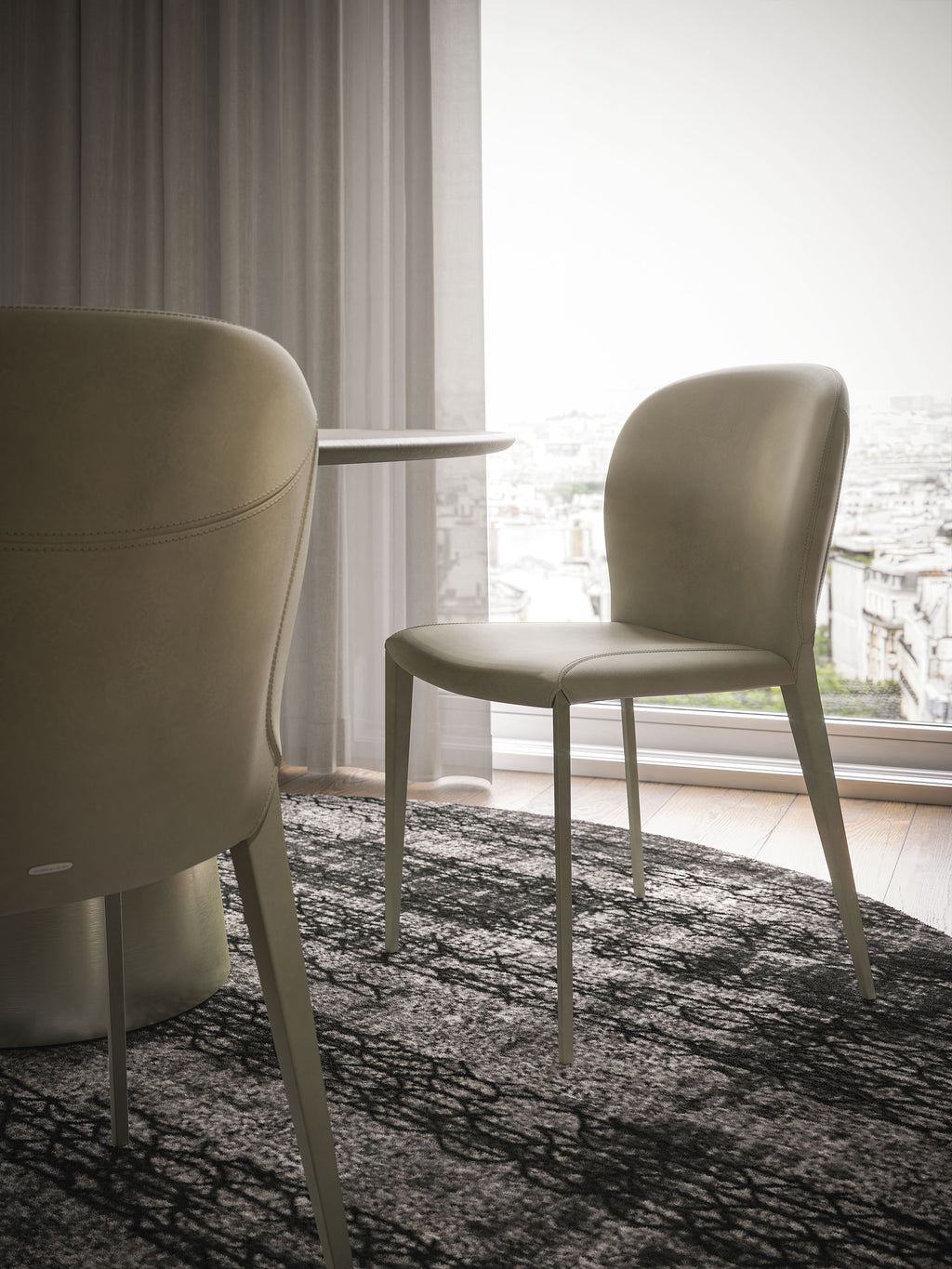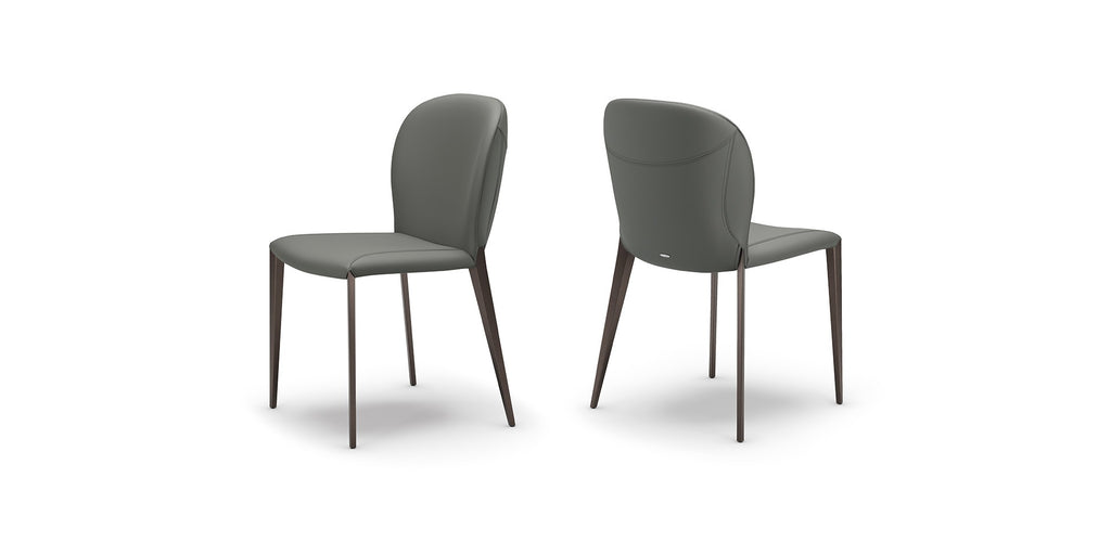 The Nancy ML Chair by Cattelan Italia combines elegance and sophistication with visible, slender steel legs that enhance its timeless aesthetic appeal. This modern designer chair features an enveloping seat design with upholstered back and seat, making it an ideal elegant and functional dining table chair. Its refined textile details dialogue harmoniously with ergonomics designed to accommodate the body in maximum comfort, while sinuous forms are beautifully accentuated by matching stitching on both seat and backrest.