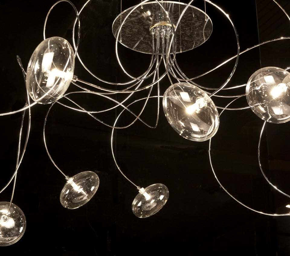 - Refined Materials: Chromed or black chromed steel arms paired with transparent borosilicate glass lampshades and a central disk in transparent methacrylate.
