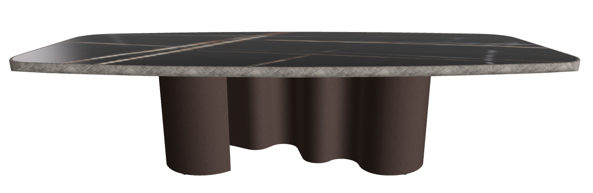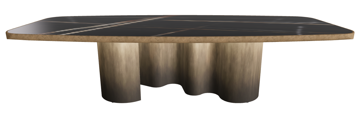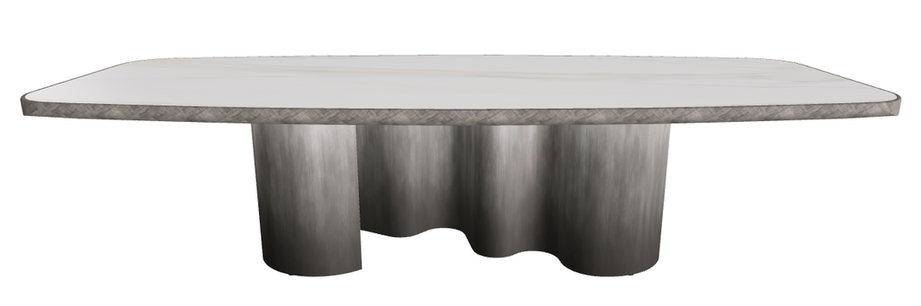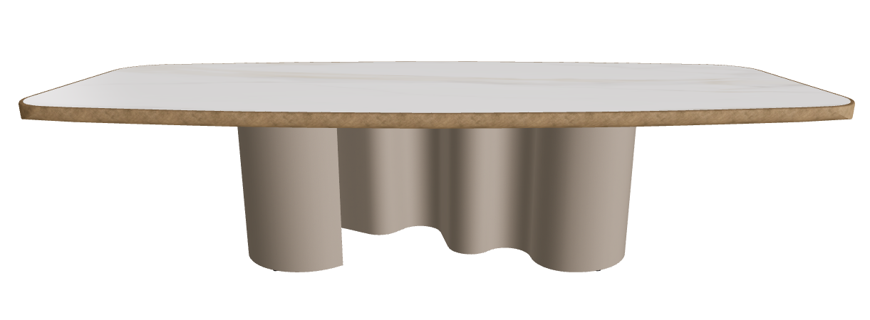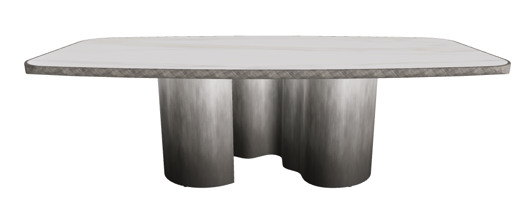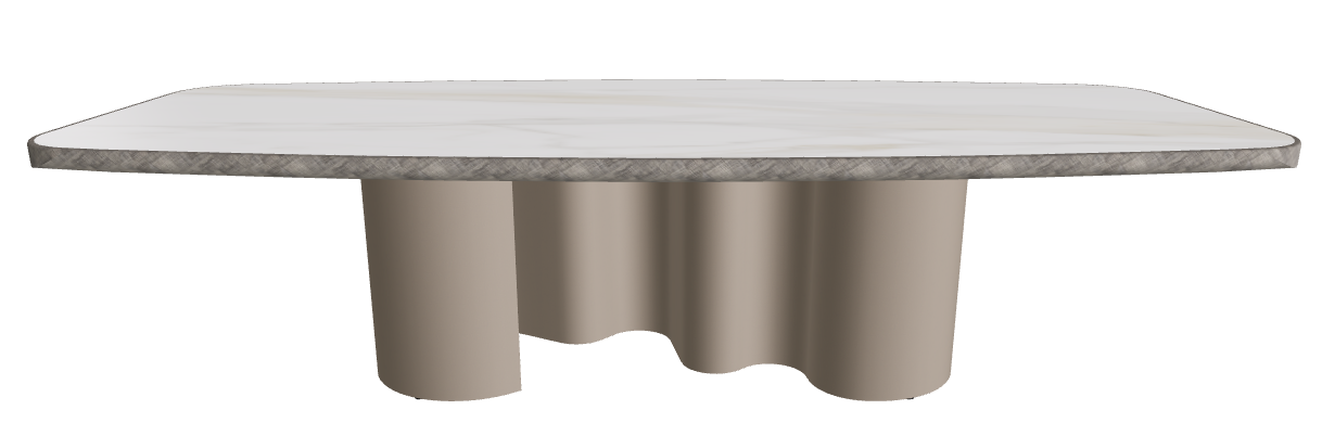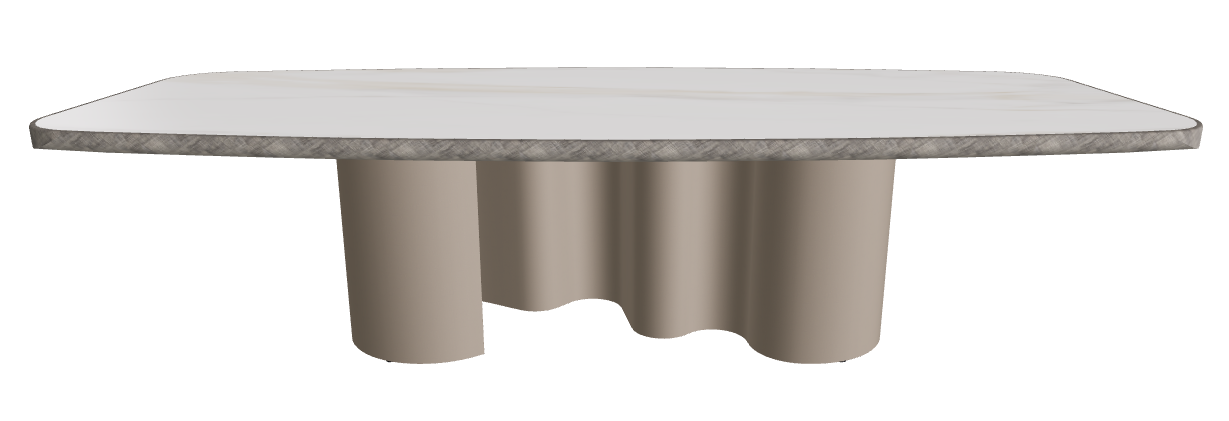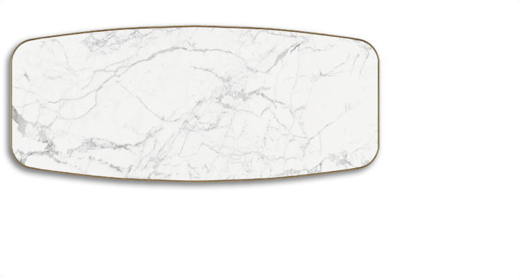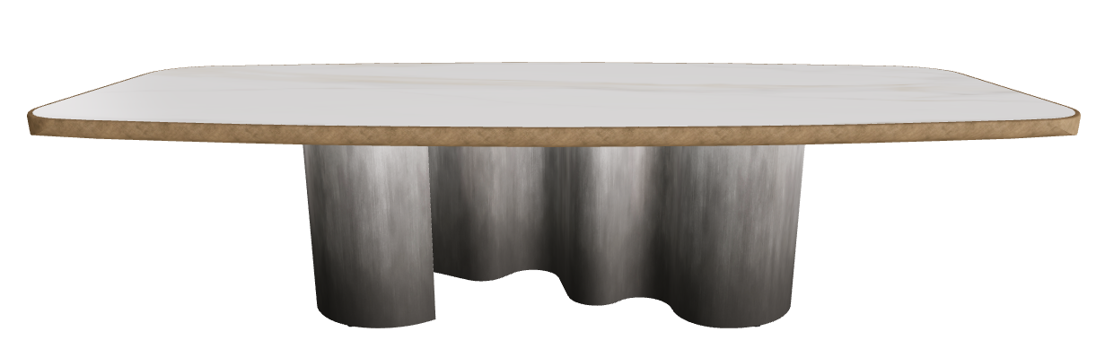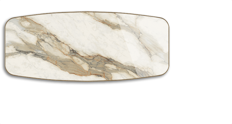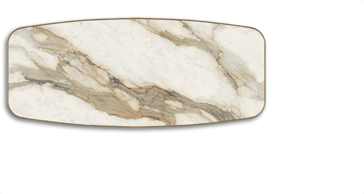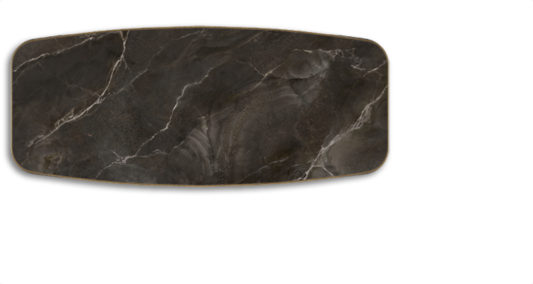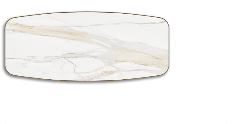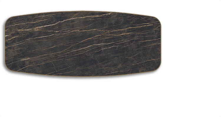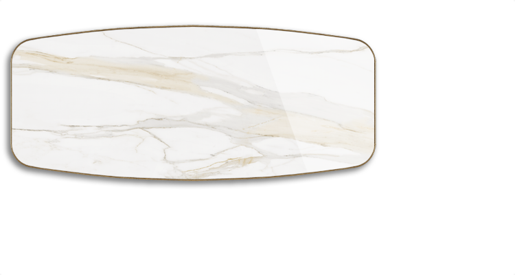 Premium Ceramic Top: Barrel-shaped surface available in 240×120 or 300×128 cm format, edged with real brushed metal for added character and refinement.