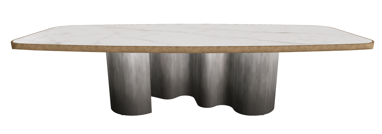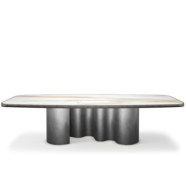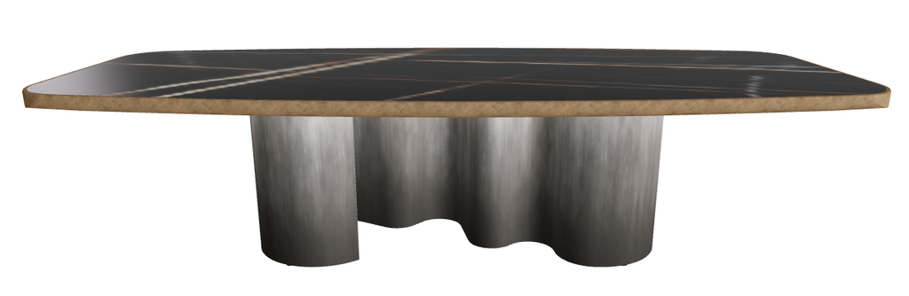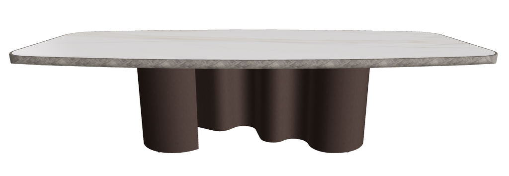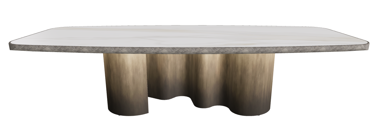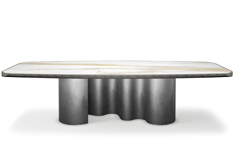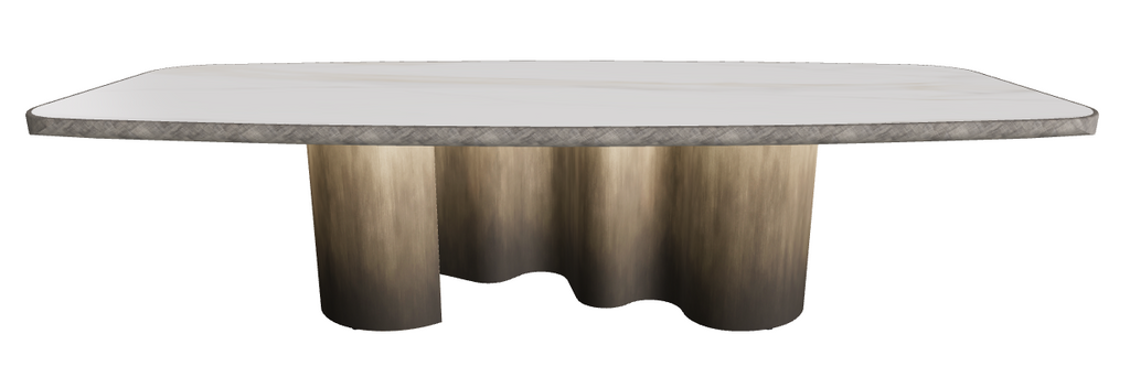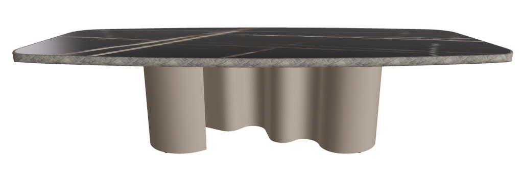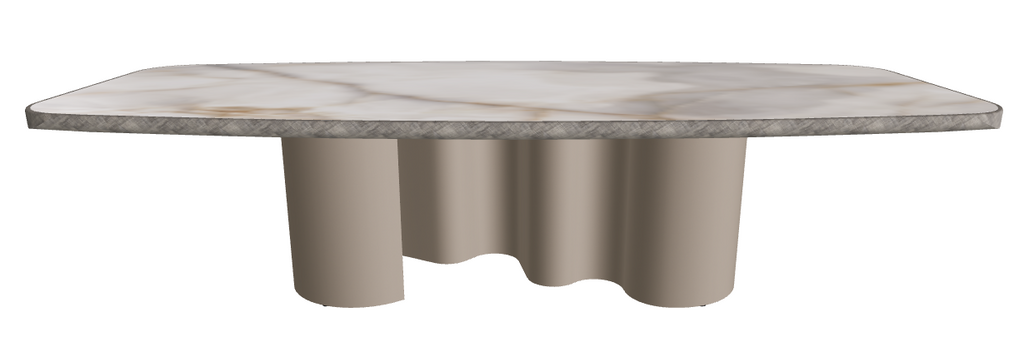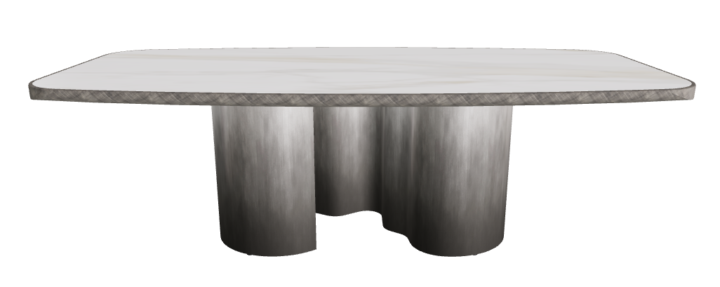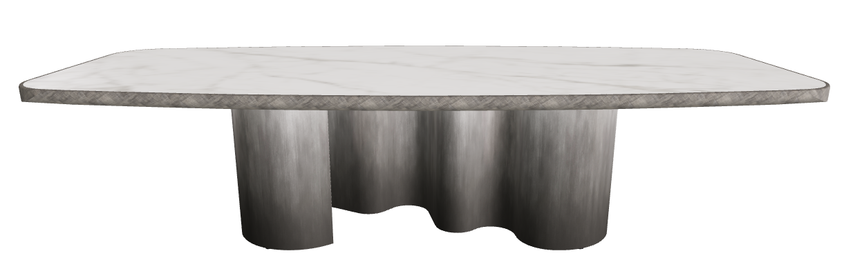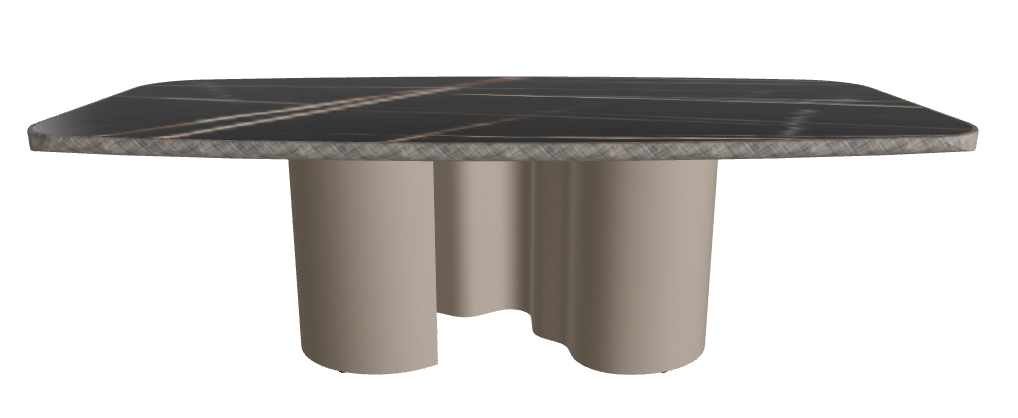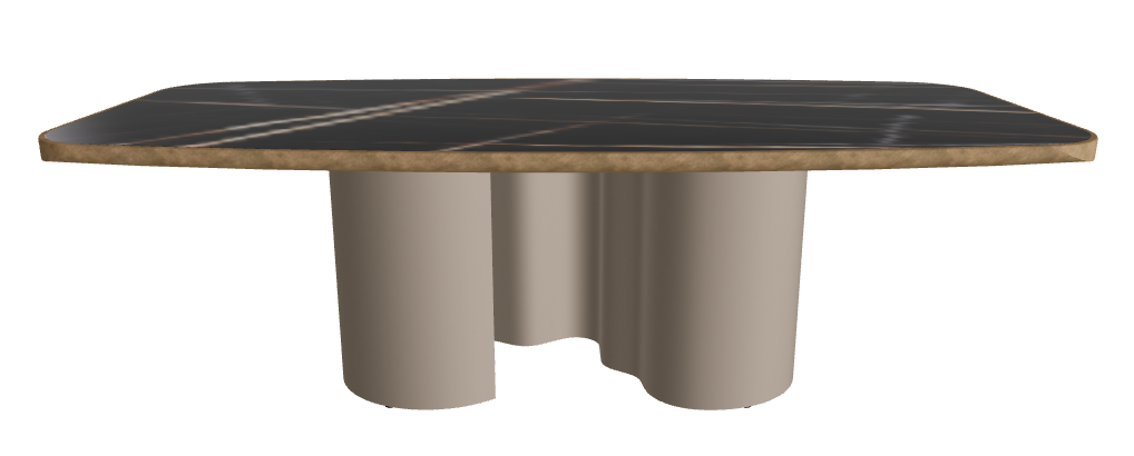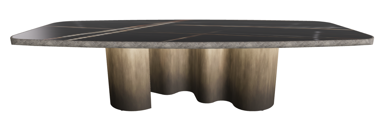 Premium Ceramic Top: Barrel-shaped surface available in 240×120 or 300×128 cm format, edged with real brushed metal for added character and refinement.