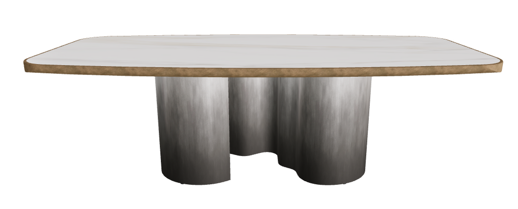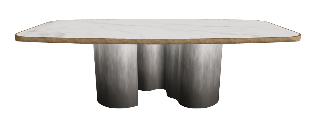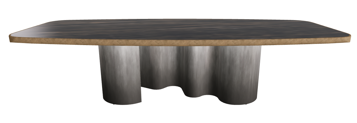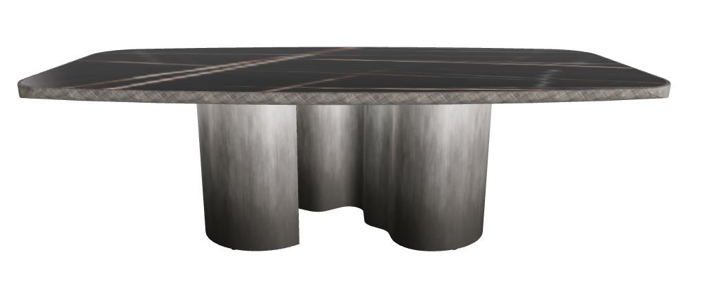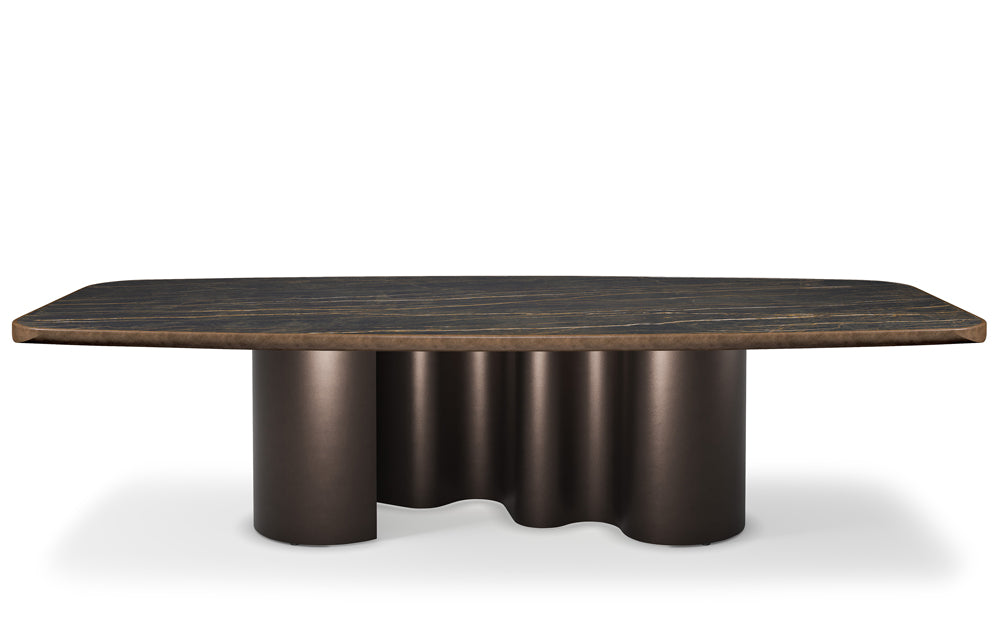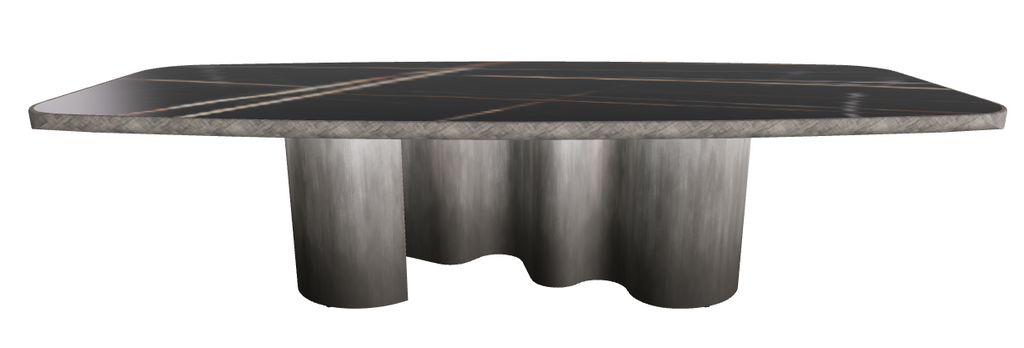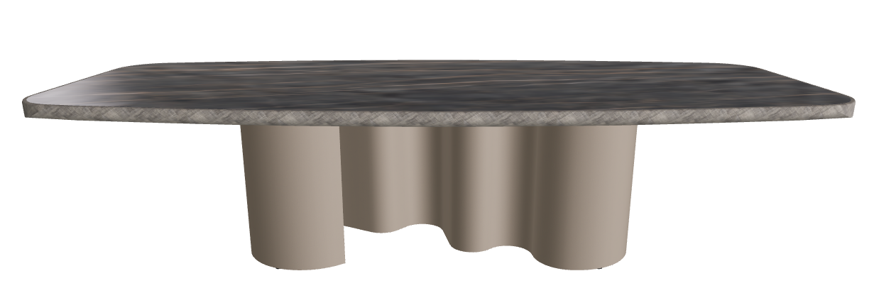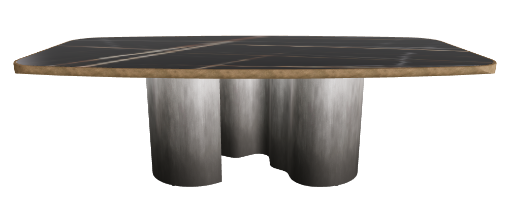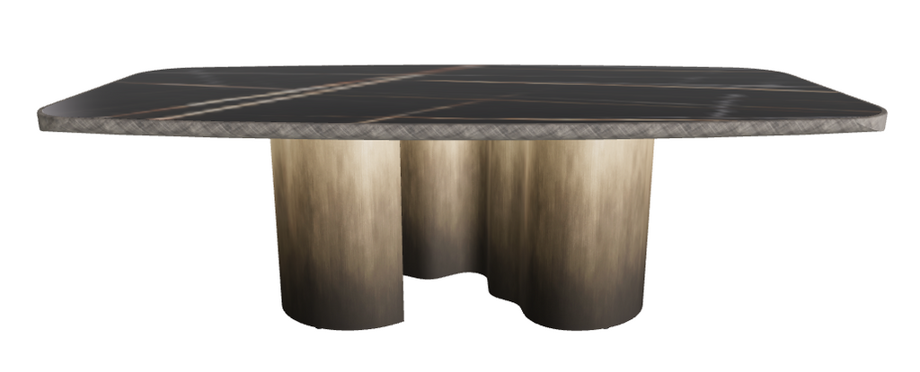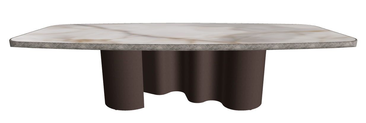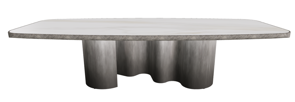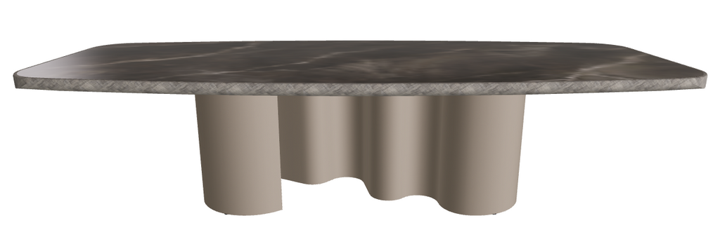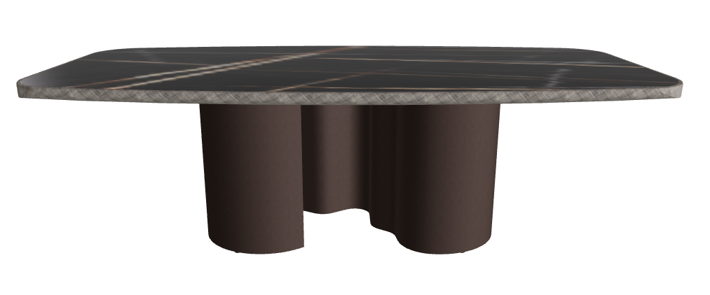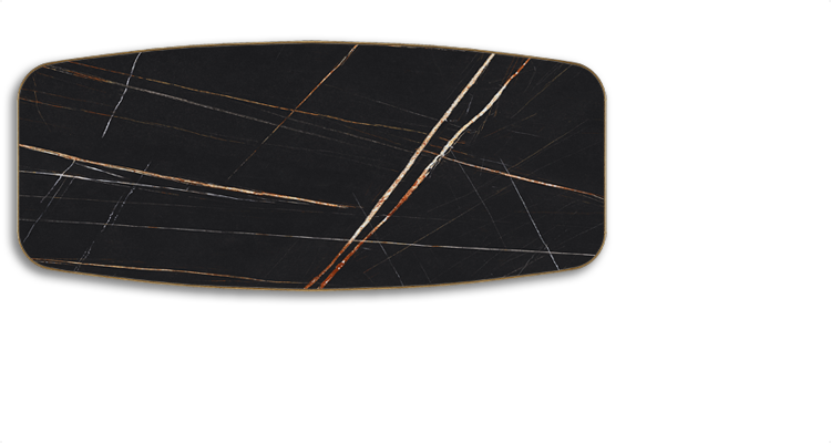Premium Ceramic Top: Barrel-shaped surface available in 240×120 or 300×128 cm format, edged with real brushed metal for added character and refinement.