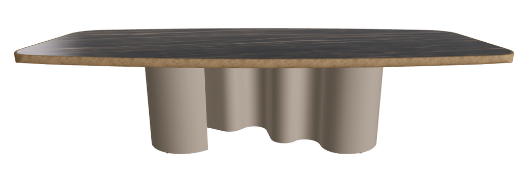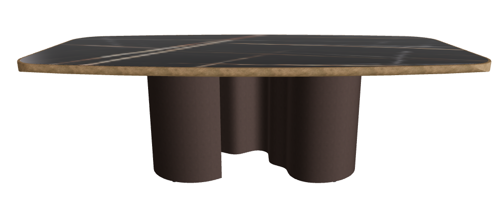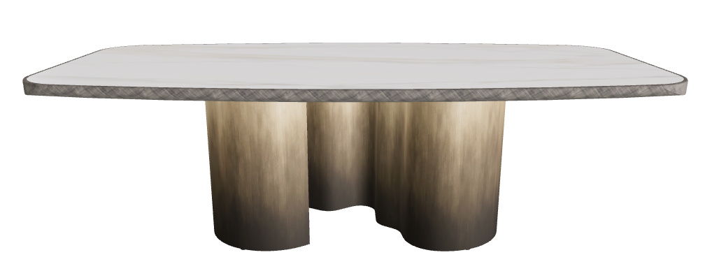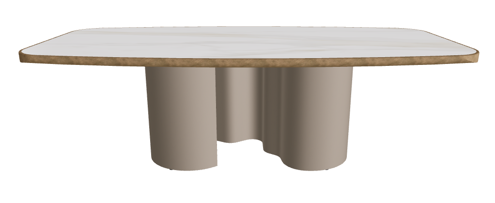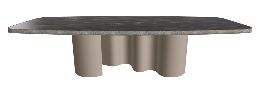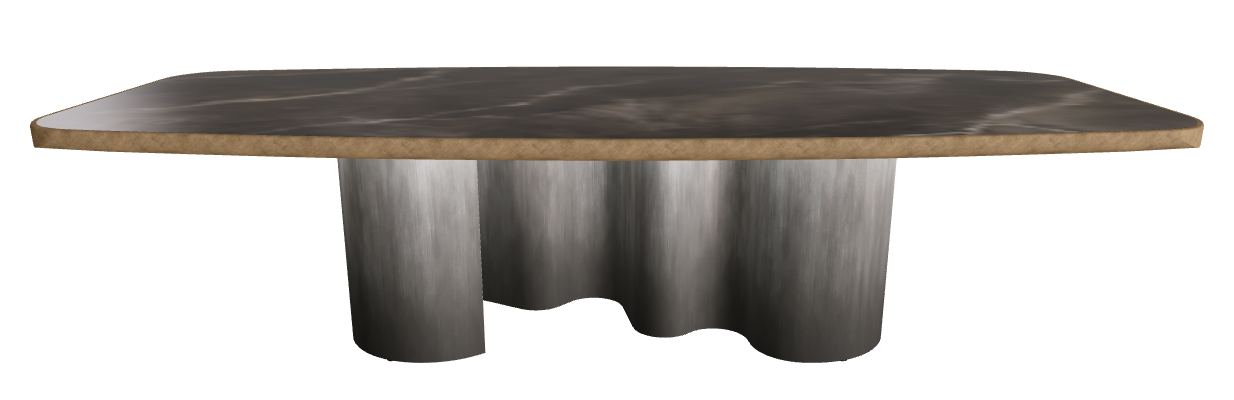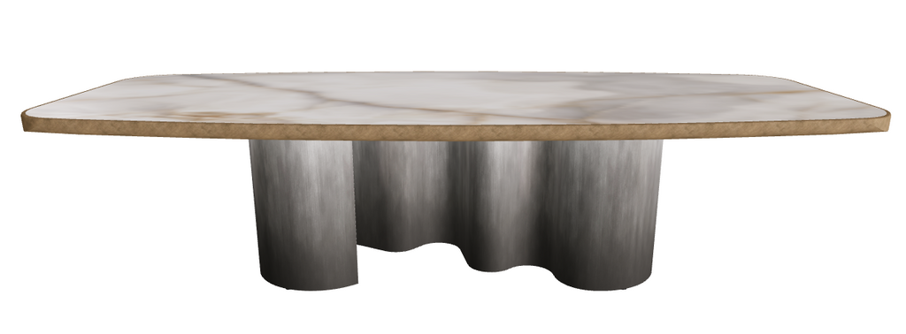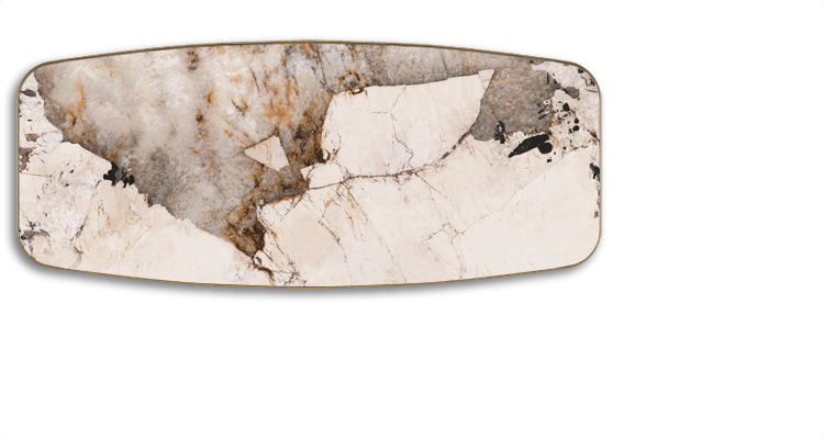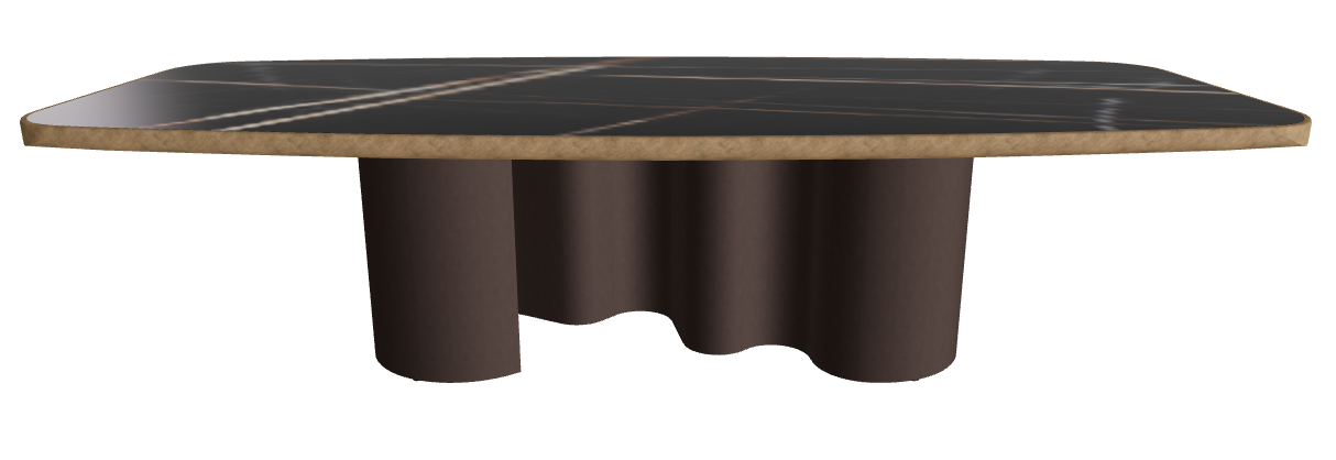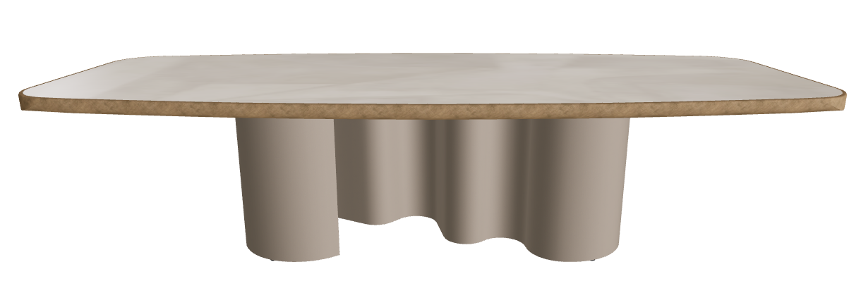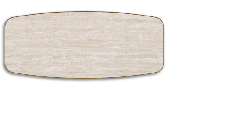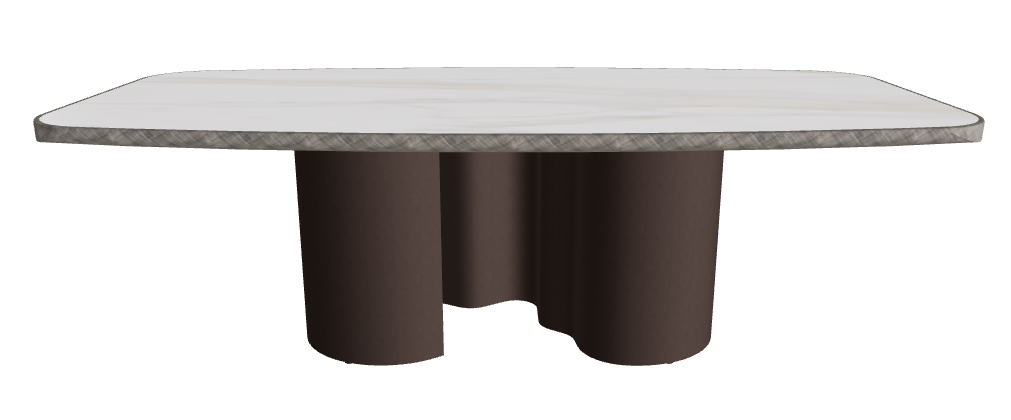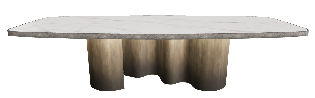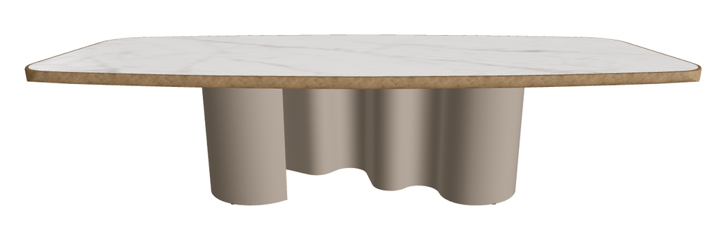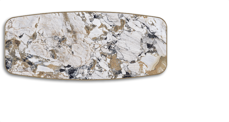Premium Ceramic Top: Barrel-shaped surface available in 240×120 or 300×128 cm format, edged with real brushed metal for added character and refinement.