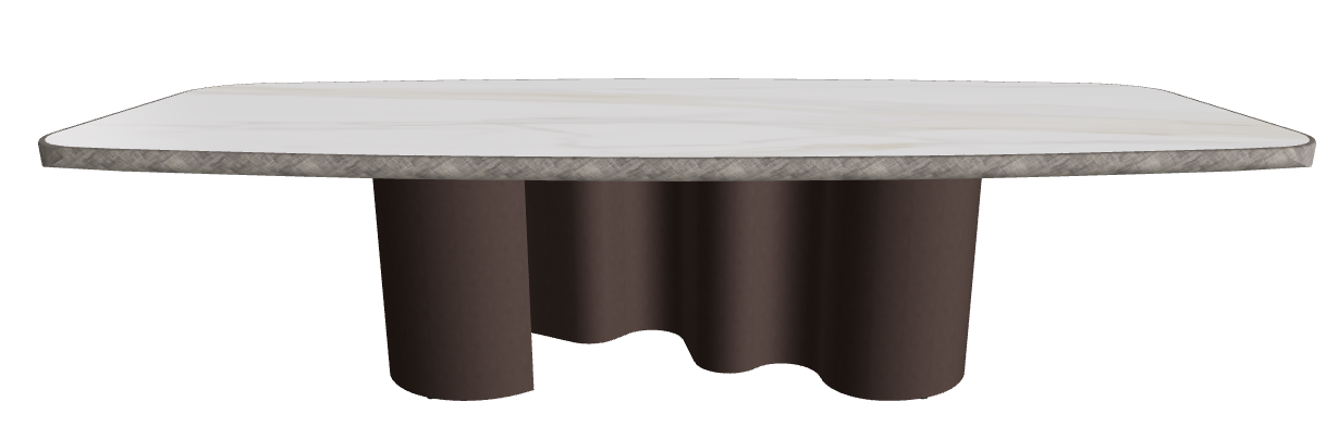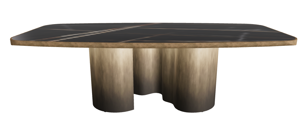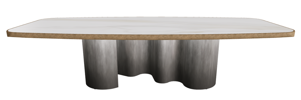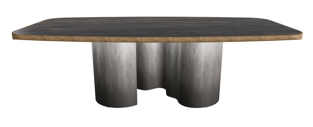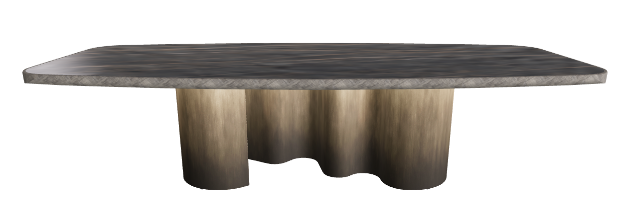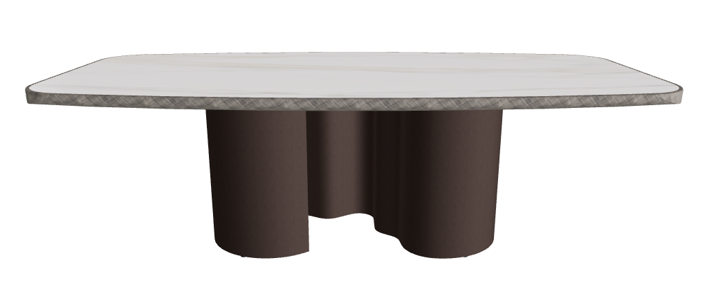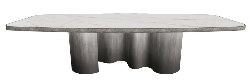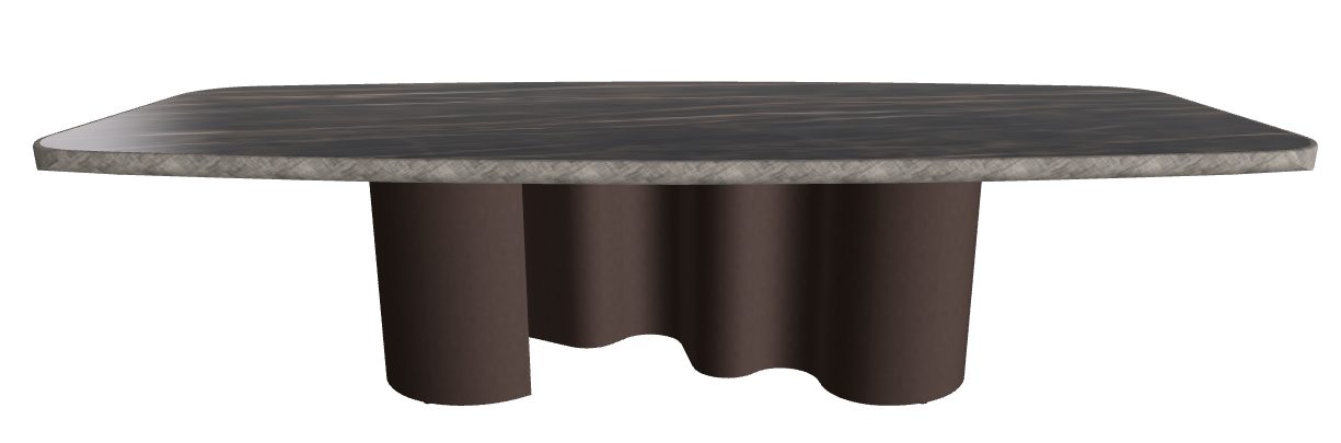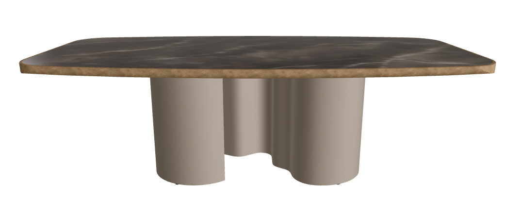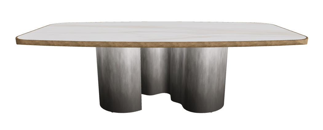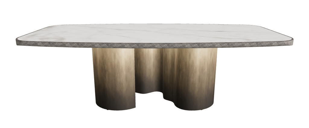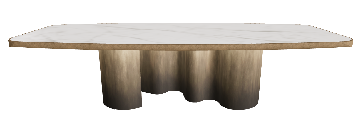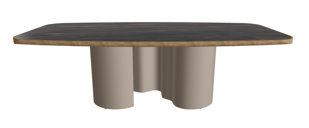 Premium Ceramic Top: Barrel-shaped surface available in 240×120 or 300×128 cm format, edged with real brushed metal for added character and refinement.