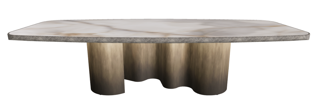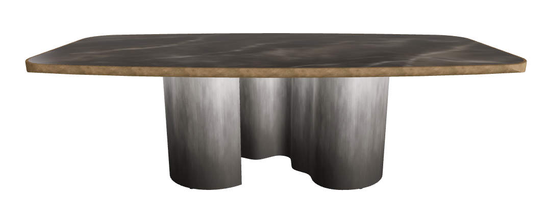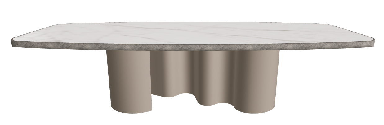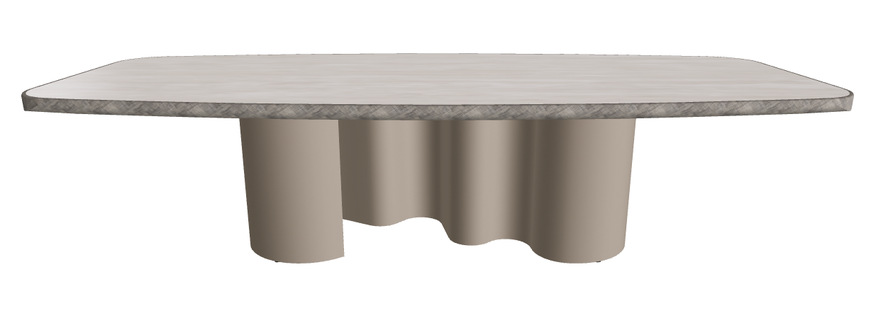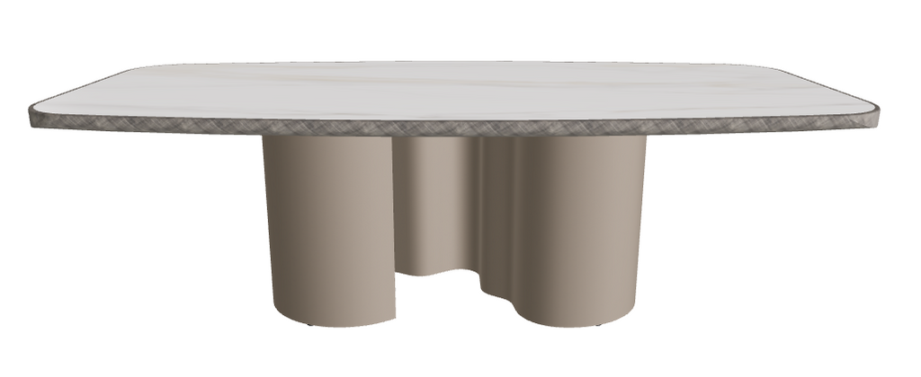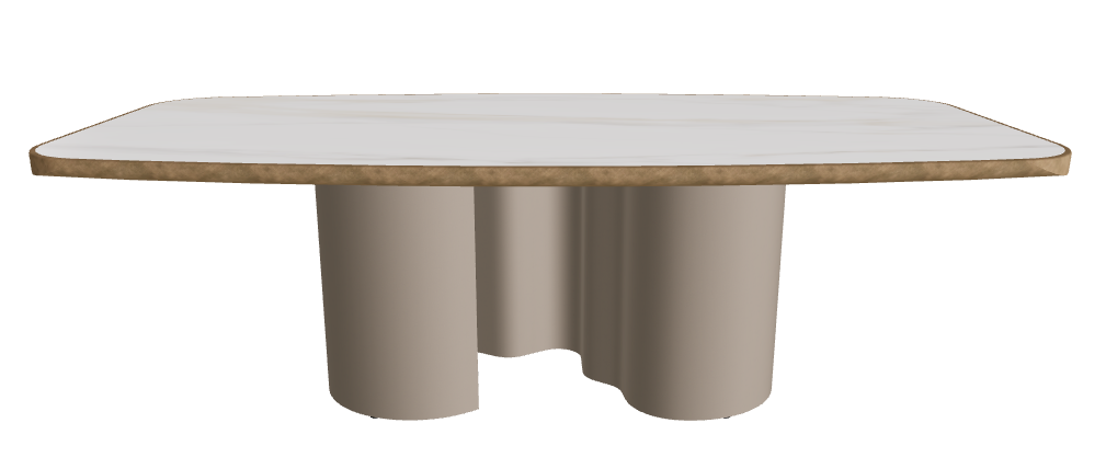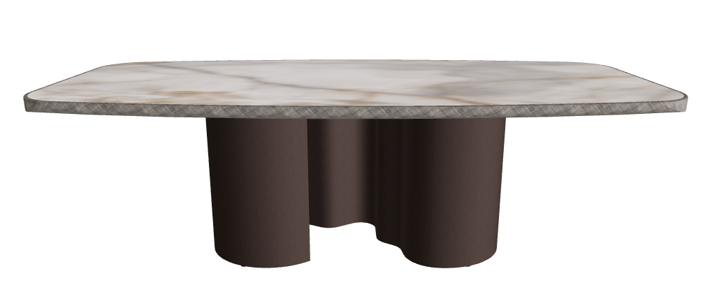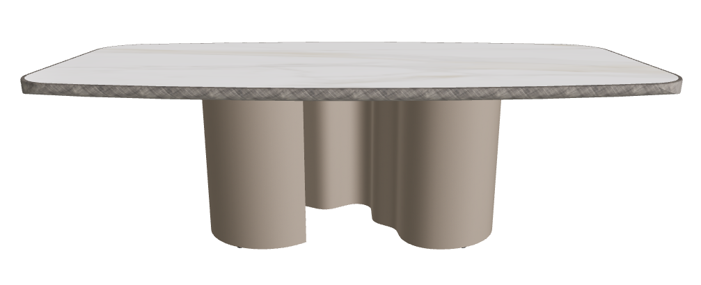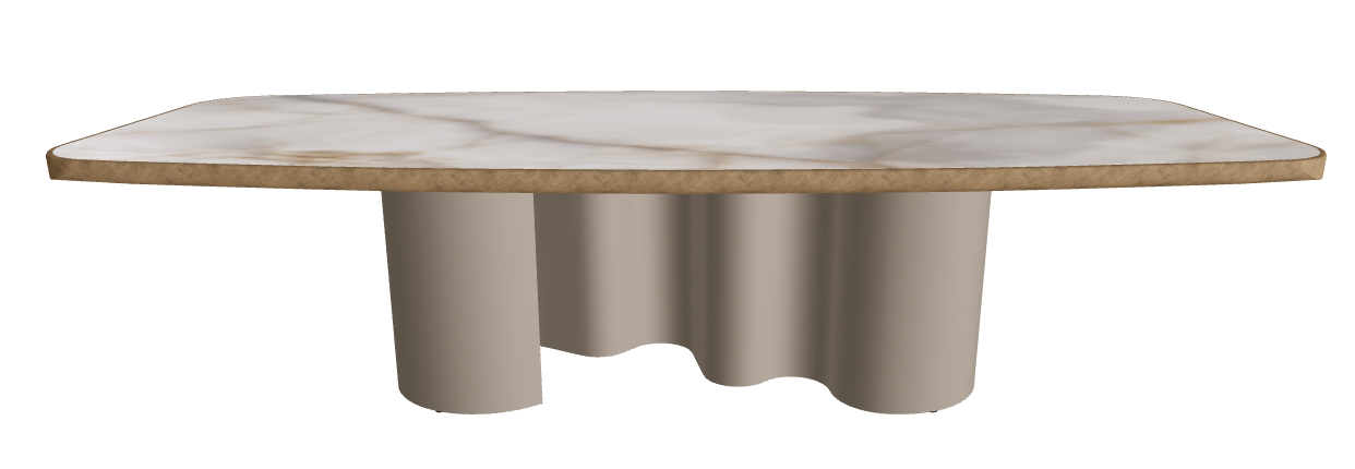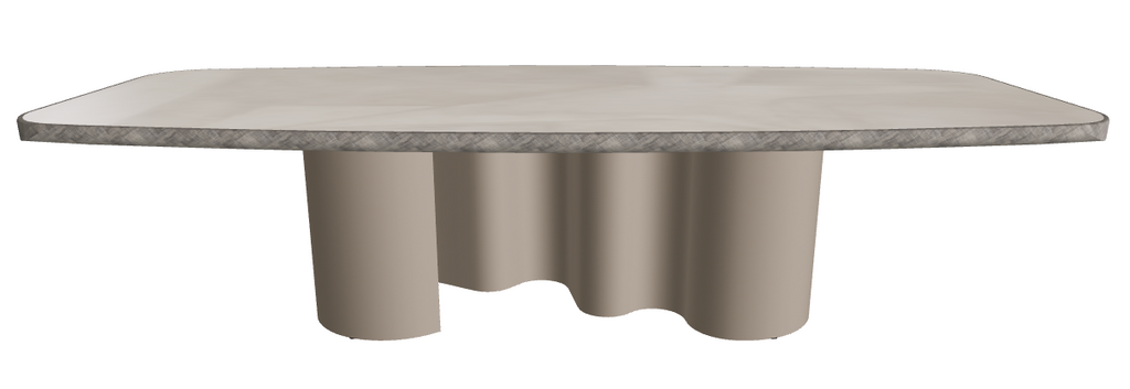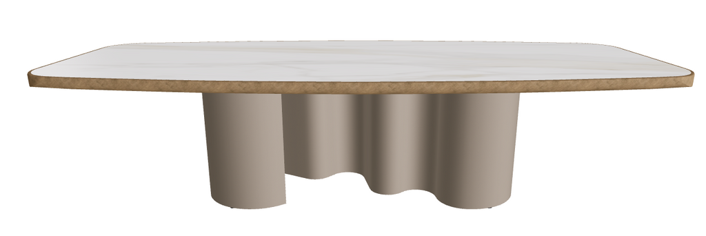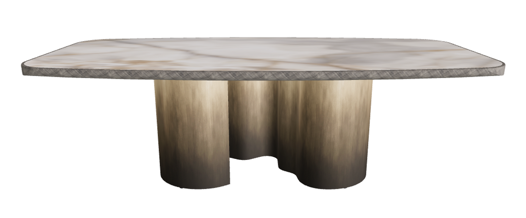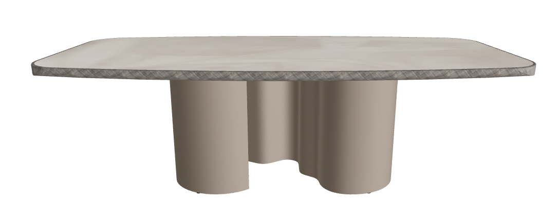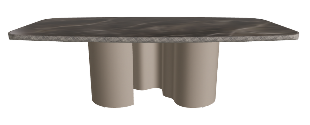 Premium Ceramic Top: Barrel-shaped surface available in 240×120 or 300×128 cm format, edged with real brushed metal for added character and refinement.