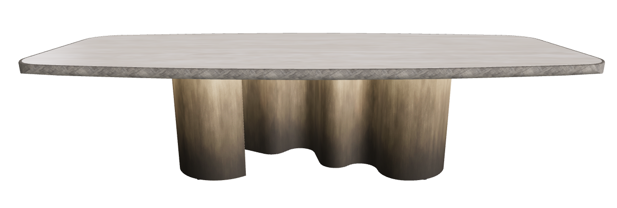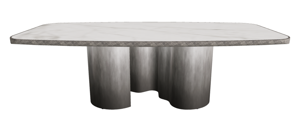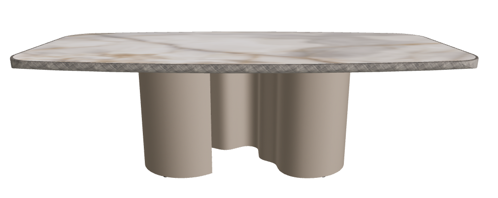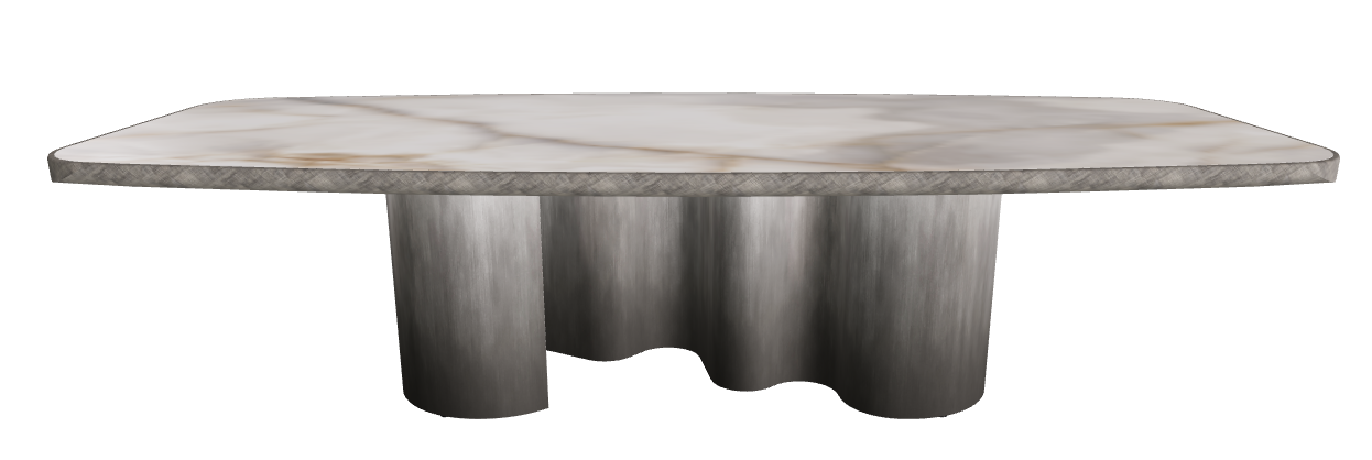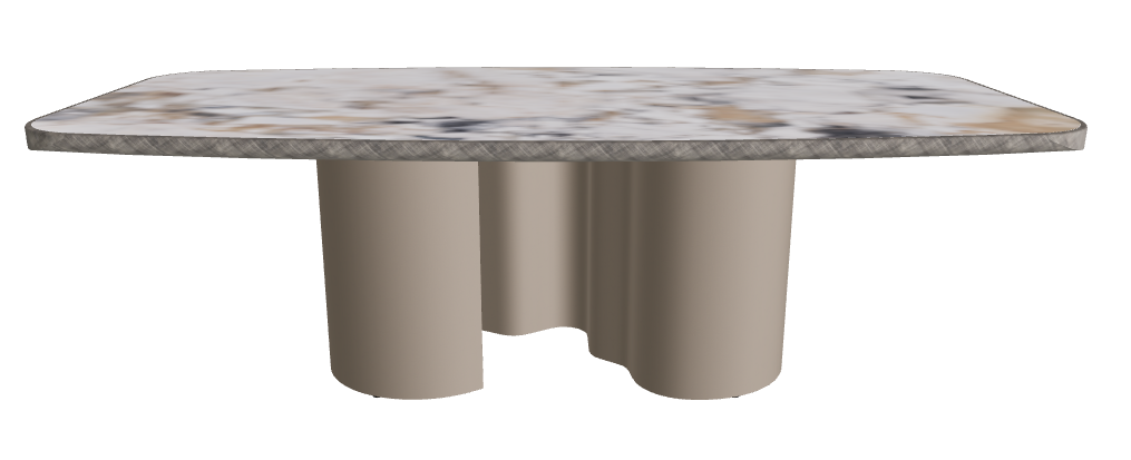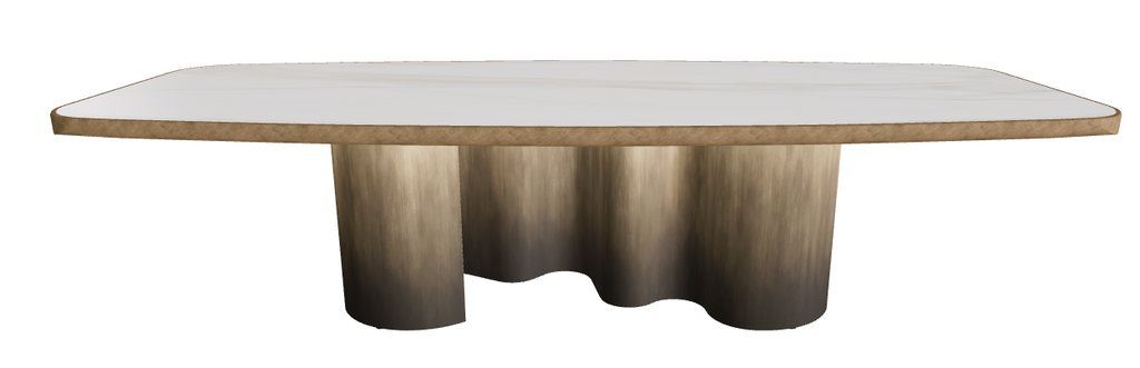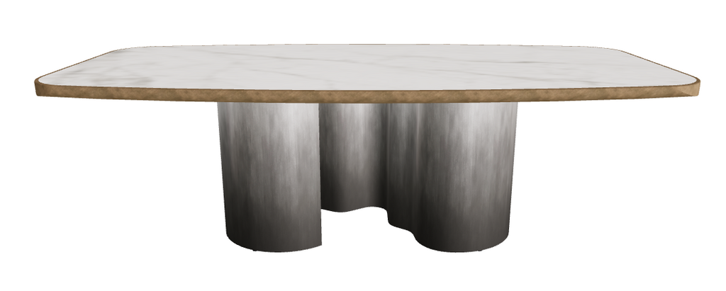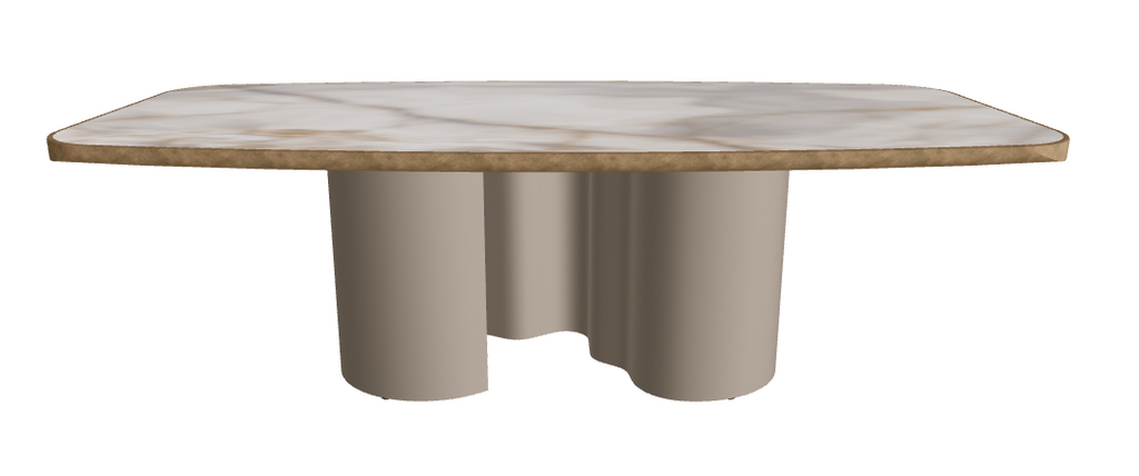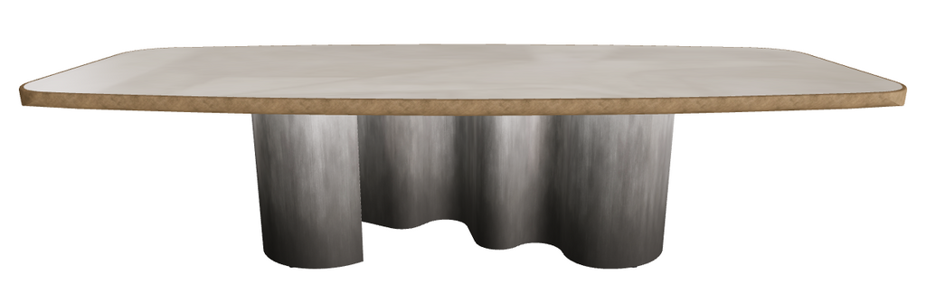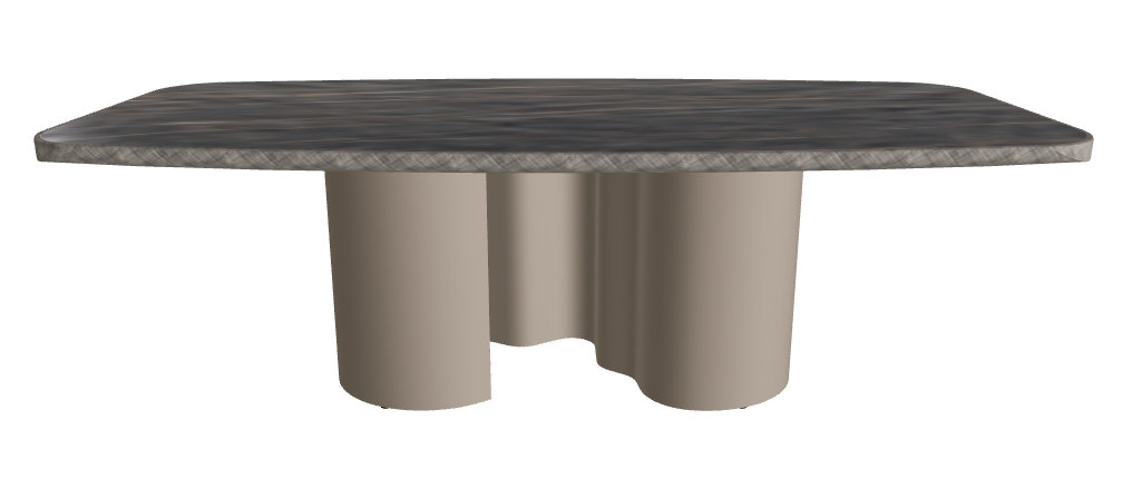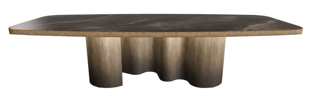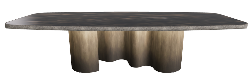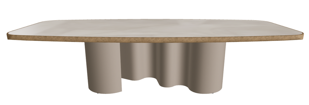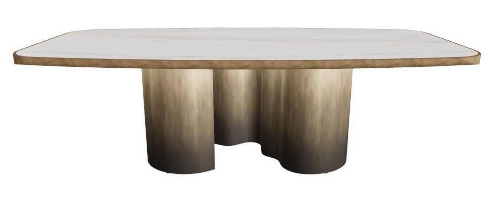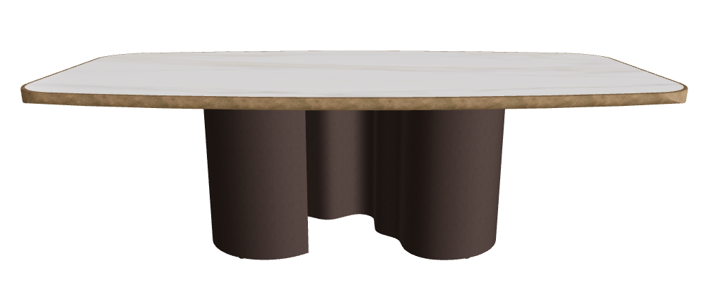 Premium Ceramic Top: Barrel-shaped surface available in 240×120 or 300×128 cm format, edged with real brushed metal for added character and refinement.
