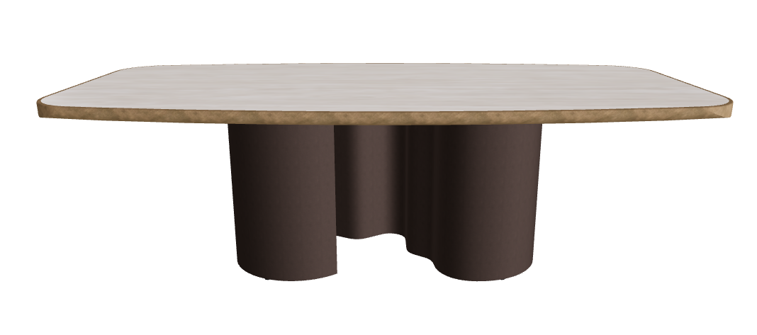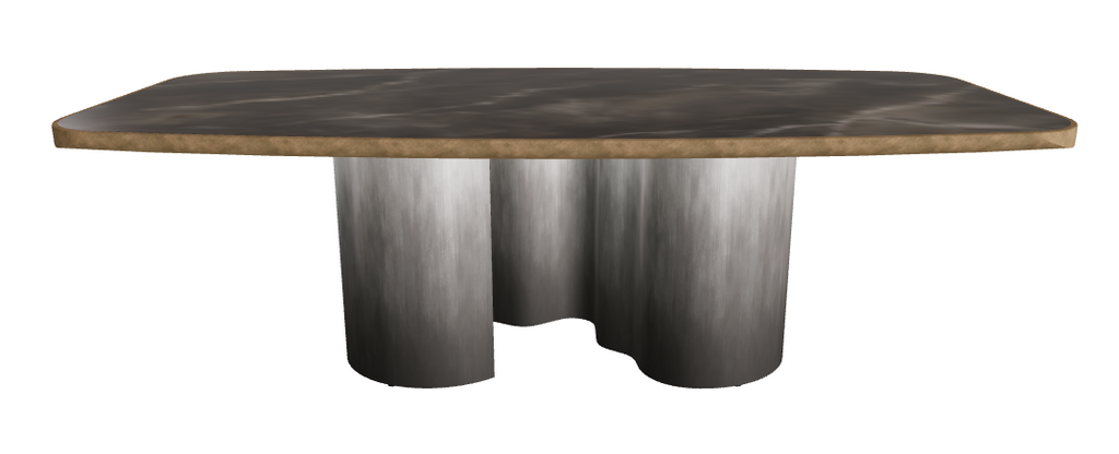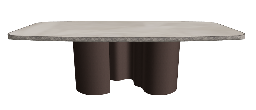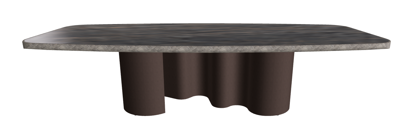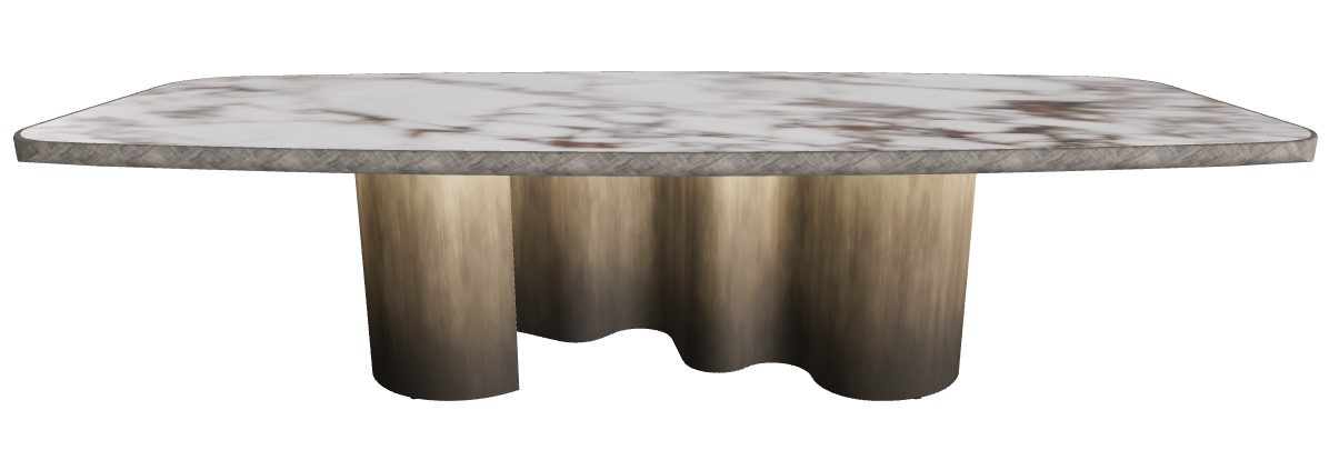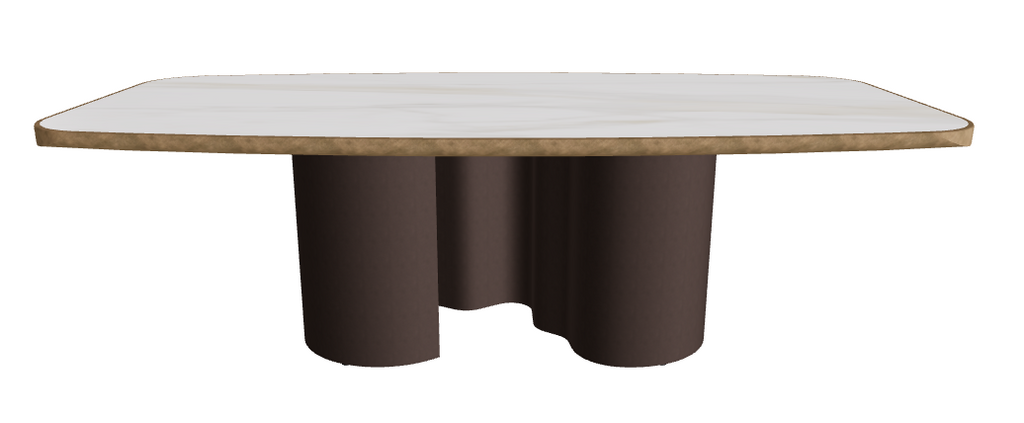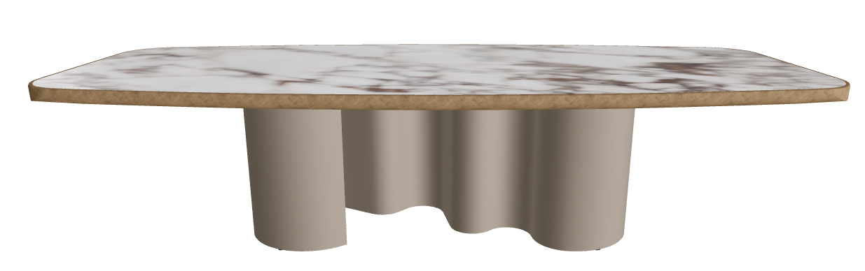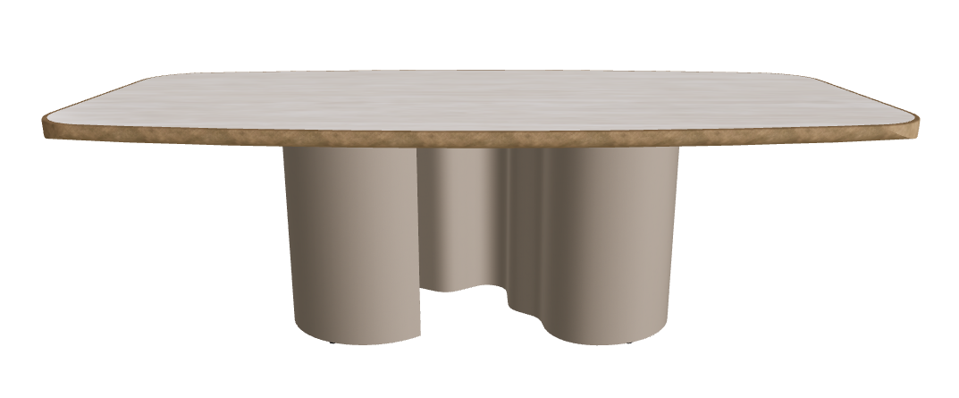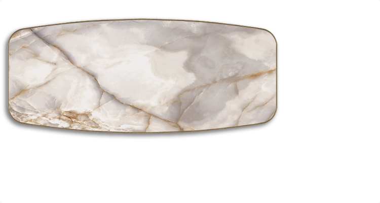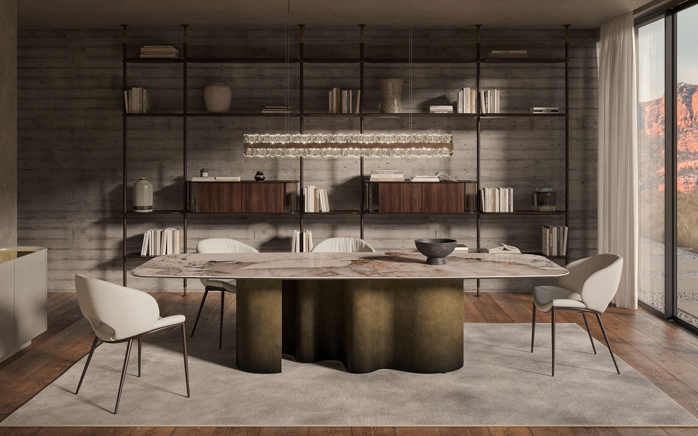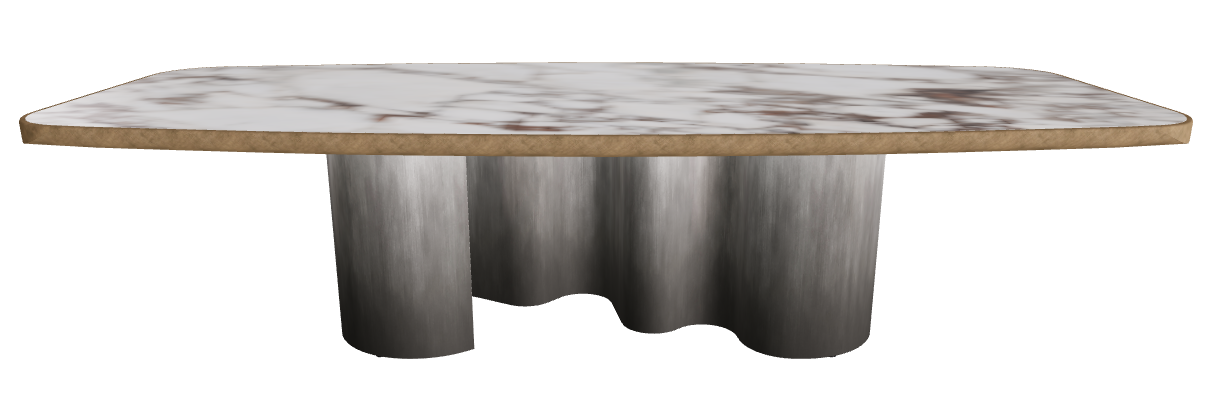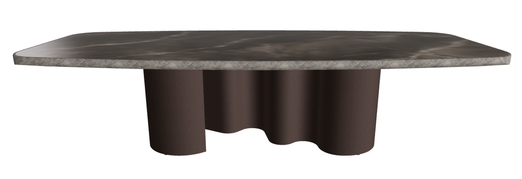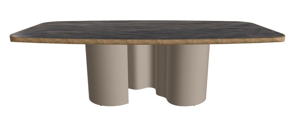 Premium Ceramic Top: Barrel-shaped surface available in 240×120 or 300×128 cm format, edged with real brushed metal for added character and refinement.