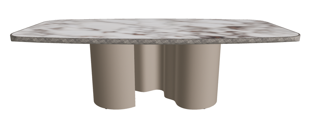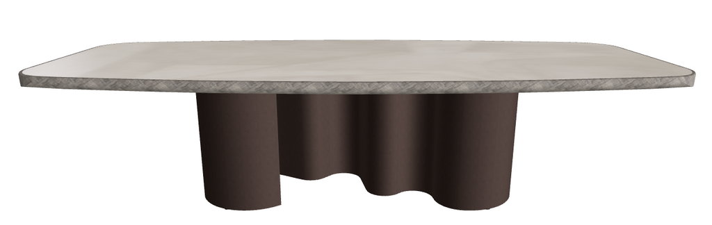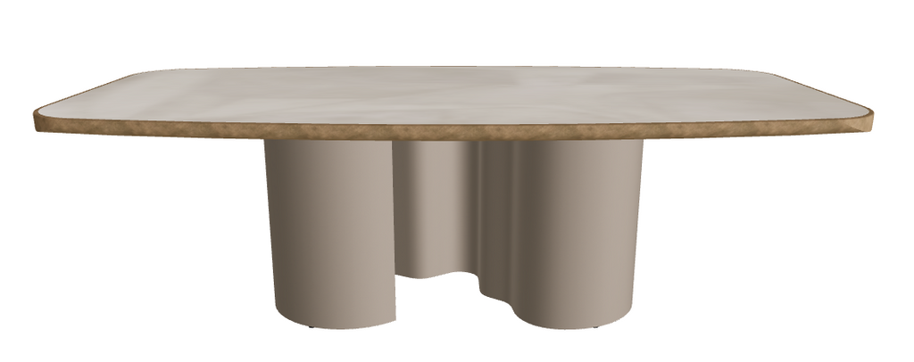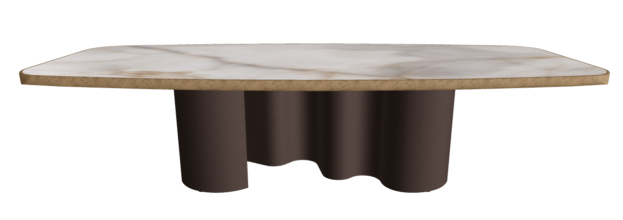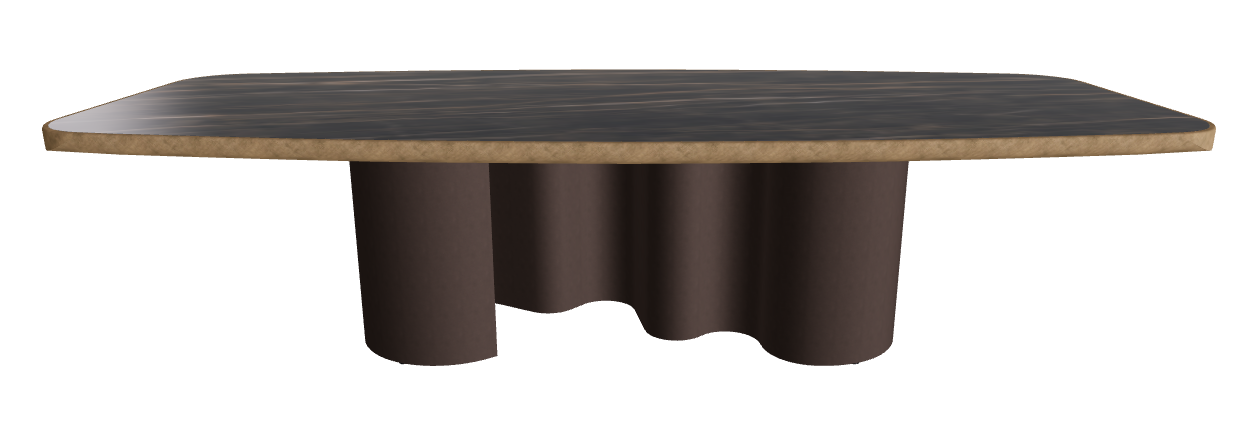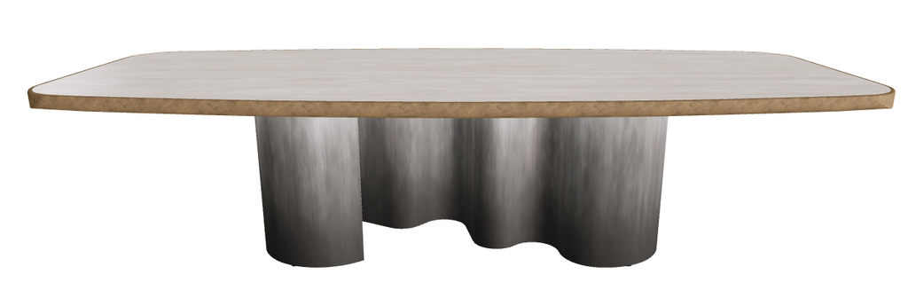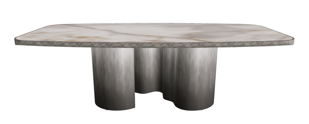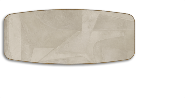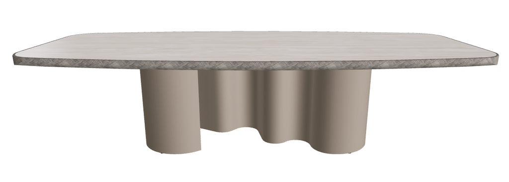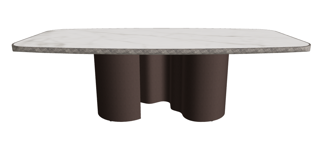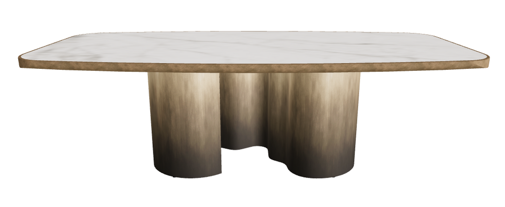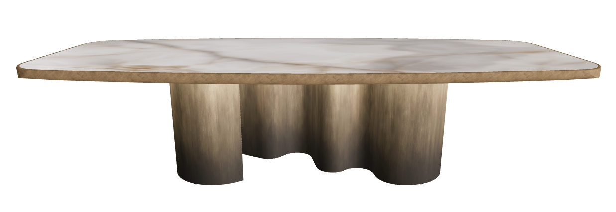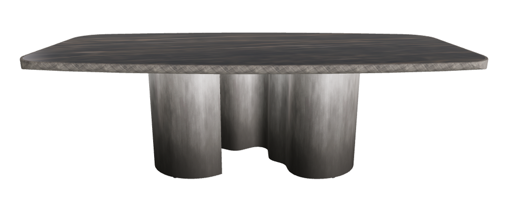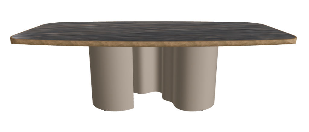 Premium Ceramic Top: Barrel-shaped surface available in 240×120 or 300×128 cm format, edged with real brushed metal for added character and refinement.