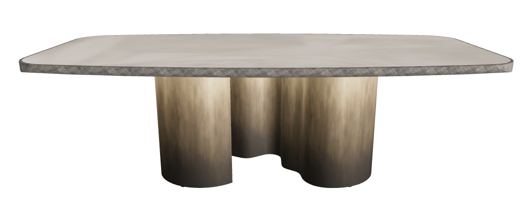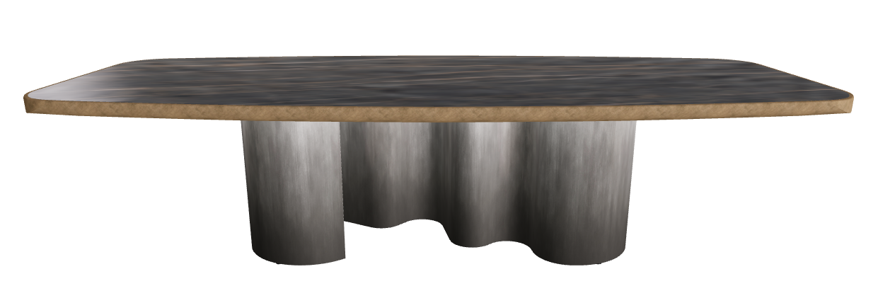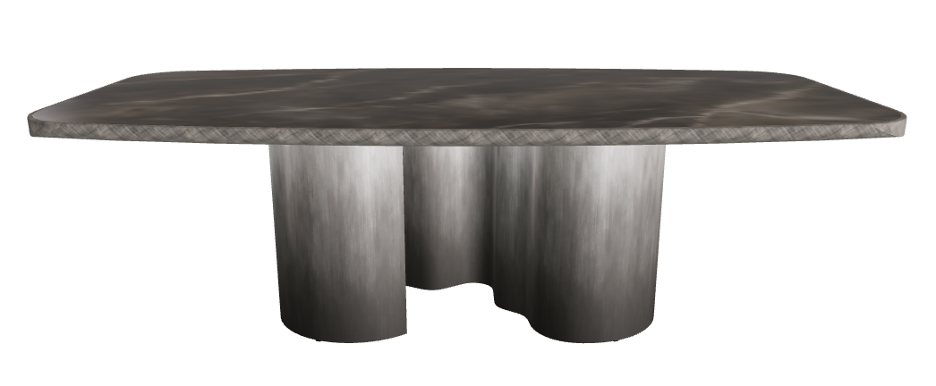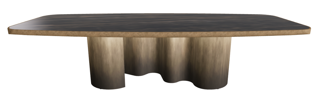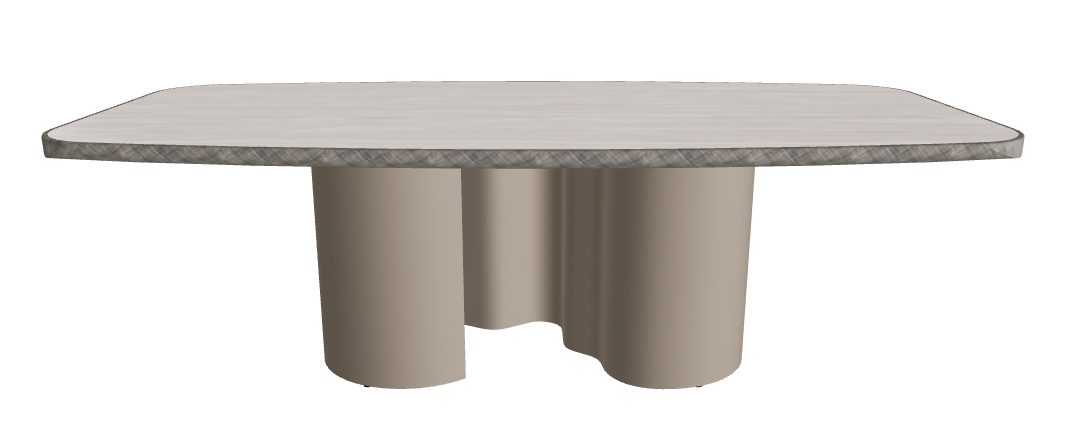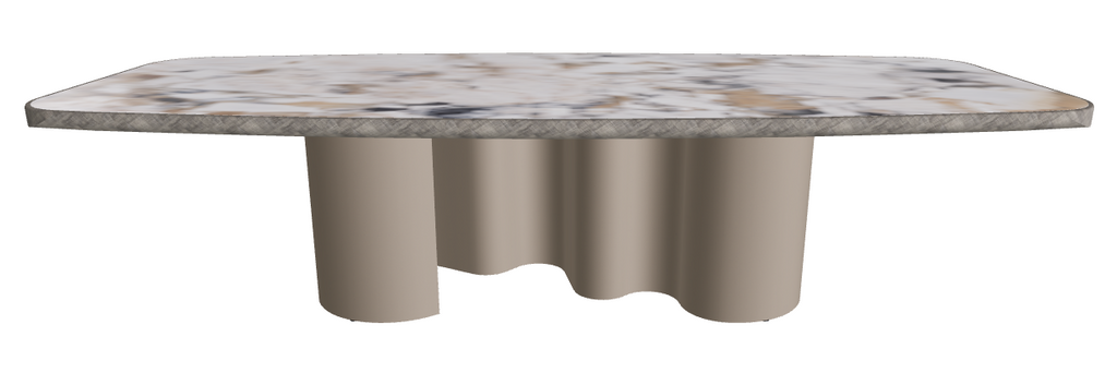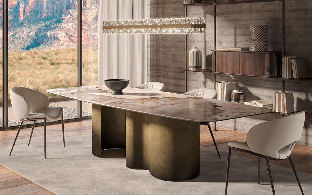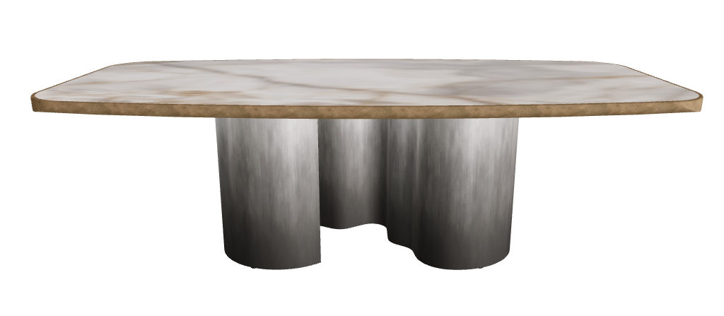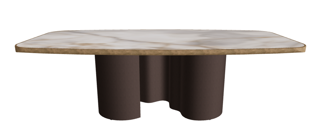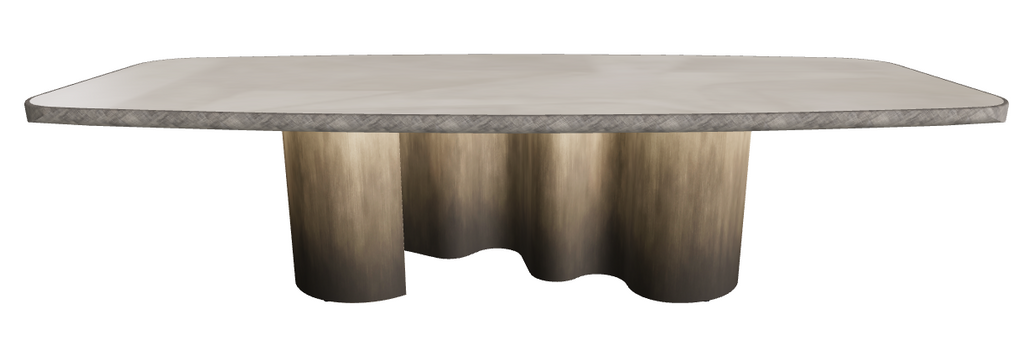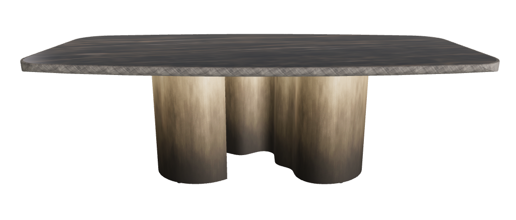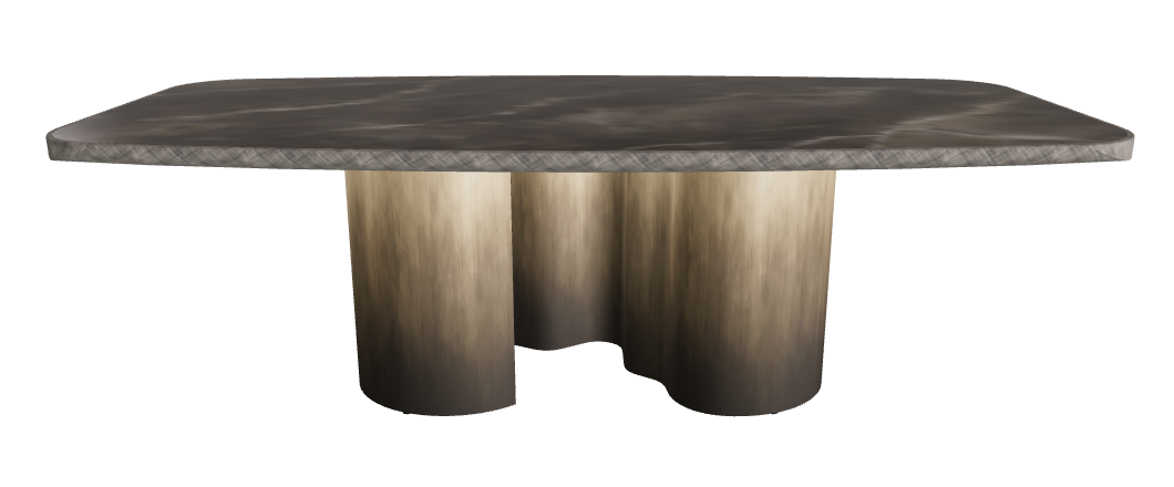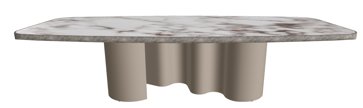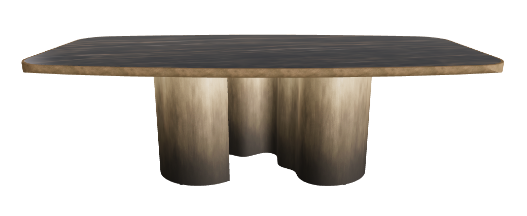 Premium Ceramic Top: Barrel-shaped surface available in 240×120 or 300×128 cm format, edged with real brushed metal for added character and refinement.
