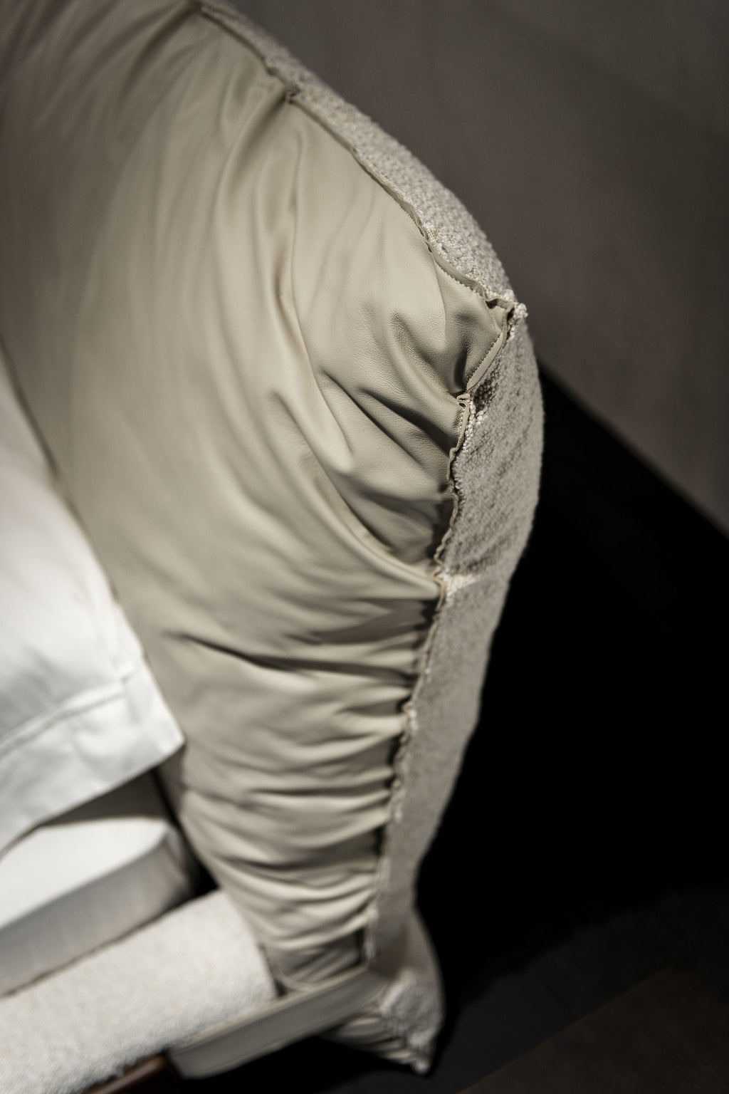 - Front/back headboard and deep off-the-floor frame upholstered in fabric, micro nubuck, synthetic or soft leather.