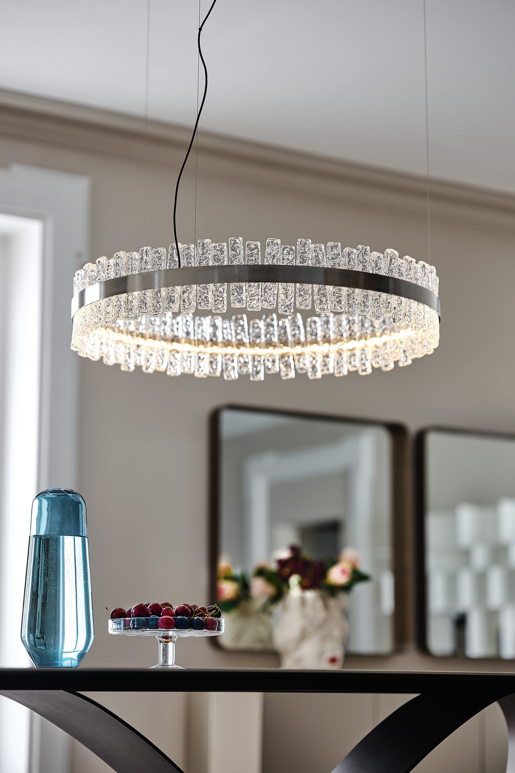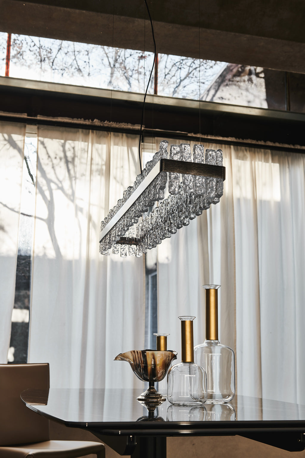 The Cattelan Italia Phoenix Ceiling Lamp, designed by STC Studio, embodies sophisticated Italian craftsmanship with its elegant handmade glass elements. Its refined, luminous presence is perfect for modern living and dining spaces, harmonising beautifully with both rectangular and round table arrangements.