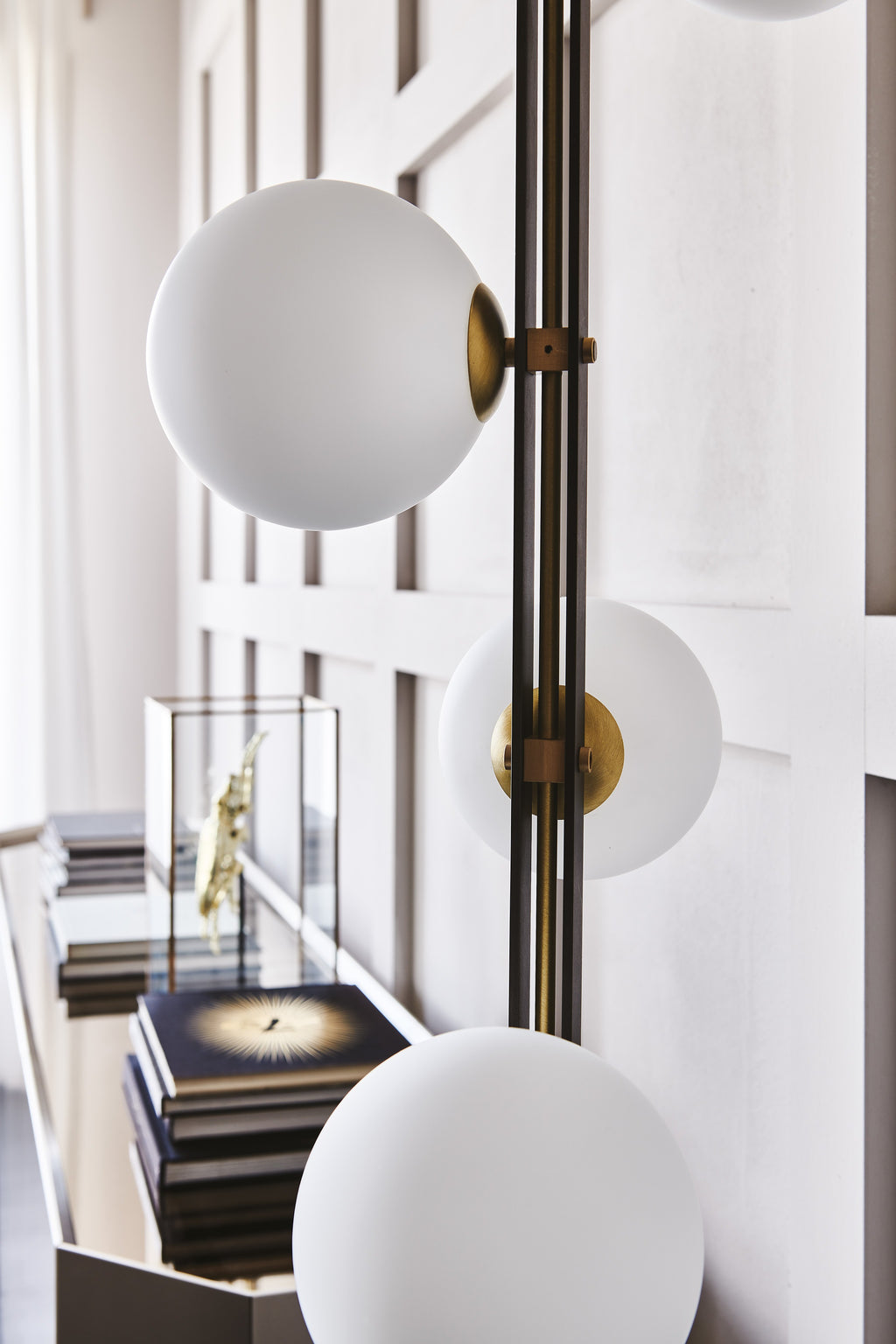 The Cattelan Italia Planeta lighting collection, designed by Studio Kronos, captures the retro charm of 1960s design with modern materials and craftsmanship. Featuring brushed brass accents, blown satin white glass, and a burnished steel structure, each lamp in the collection showcases elegance and warmth with planetary-inspired geometry.
