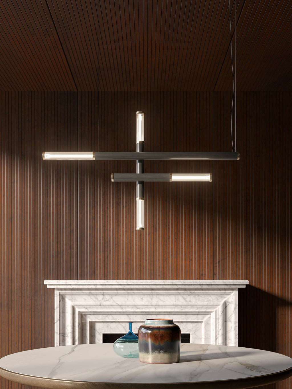 - Materials: Borosilicate ribbed glass, black chrome or titanium lacquered steel, brushed brass details
