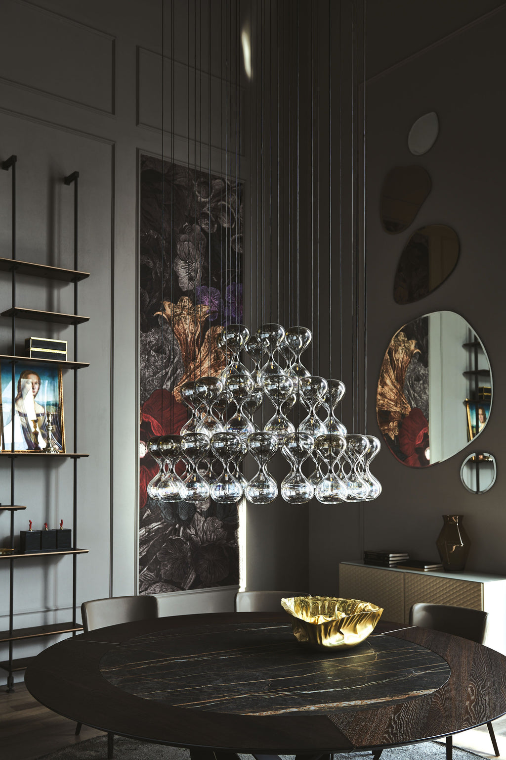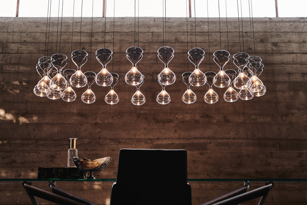 The Cattelan Italia Sablier ceiling lamp is an elegant modular chandelier system that evokes the silhouette of ancient hourglasses. This sculptural lighting piece features slender borosilicate glass shades available in clear or mixed iride-fumé finishes, suspended from a glossy black chrome ceiling plate. With flexible installation options ranging from single pendants to large clusters of up to 24 elements, Sablier transforms any interior into a space of fluid harmony and contemporary sophistication.