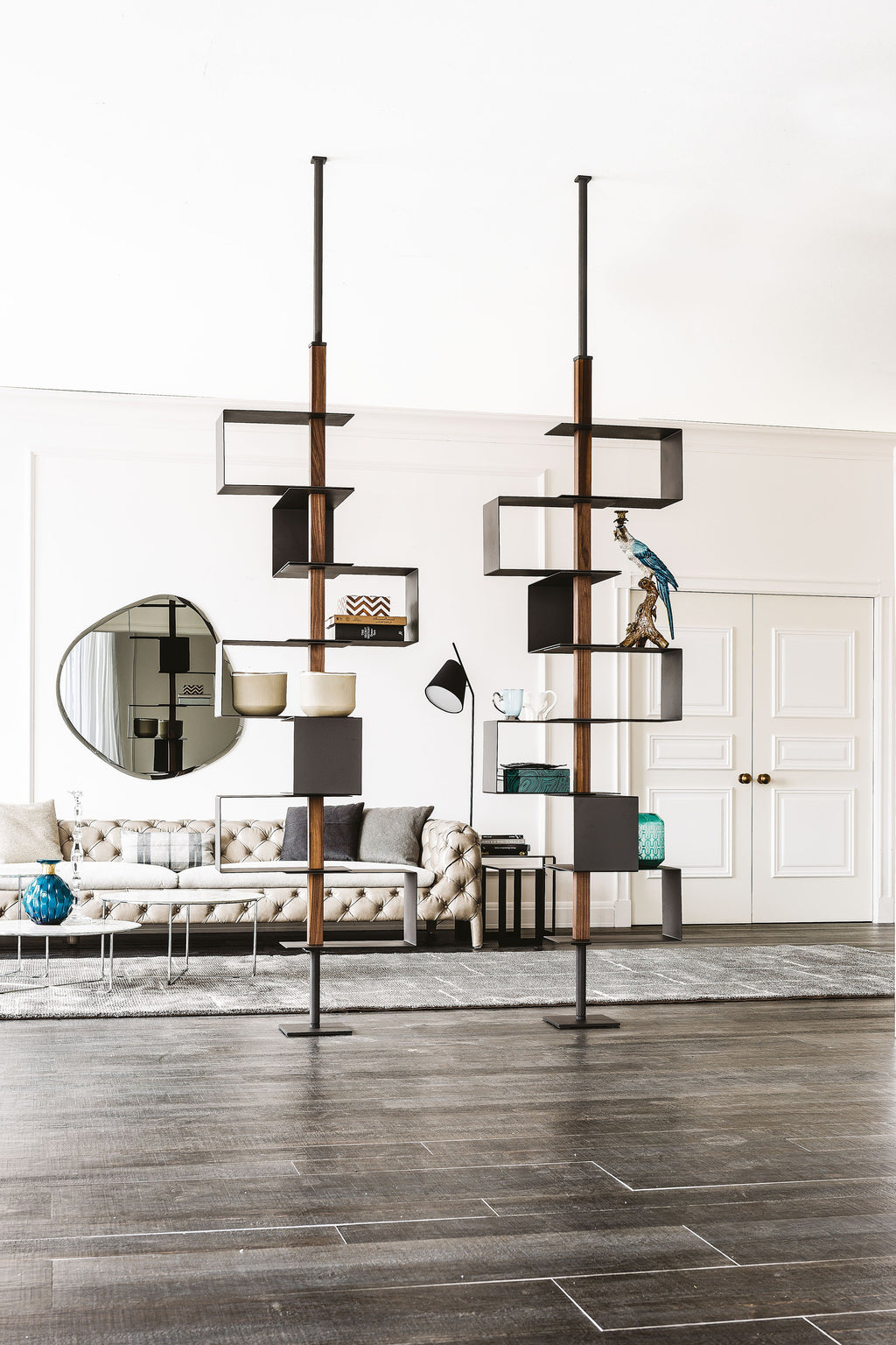 The Tokyo ceiling-hanging bookcase is a dramatic freestanding centerpiece, designed to add architectural impact and versatile display to any room. This sculptural bookcase features a vertical steel frame with multidirectional, offset shelves, offering dynamic geometry and enhanced visibility from every angle. Perfect for open-plan settings or as a showpiece, Tokyo highlights both the books and objects it holds as well as its own striking silhouette. The system is height adjustable from 240 to 300 cm, with a compact 68 x 68 cm footprint.
