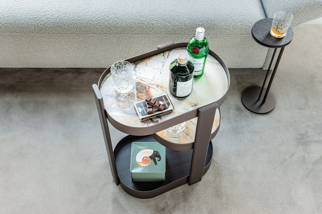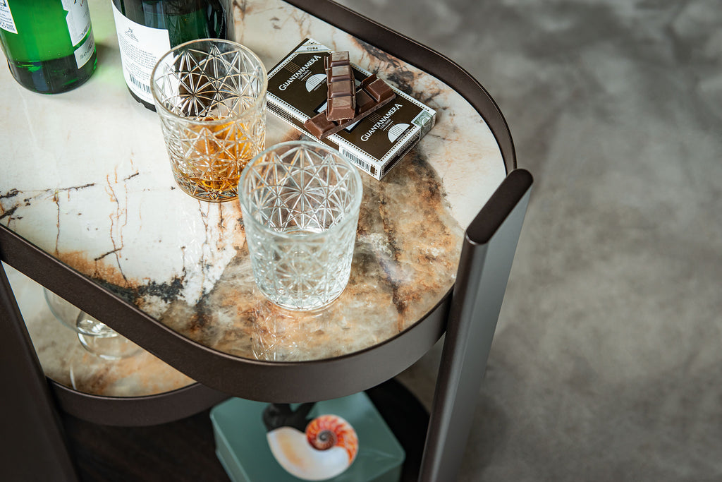 Tonic is a striking three-tier trolley bar designed as a free-standing bar unit, featuring clever hidden wheels and an integrated minimalist handlebar. Its structure blends titanium (GFM11) or bronze (GFM18) lacquered steel with inserts of fine wood (Canaletto walnut or burned oak) and captivating ceramic tops. The result is a functional yet decorative designer bar cart that stands out in contemporary living and entertaining spaces.