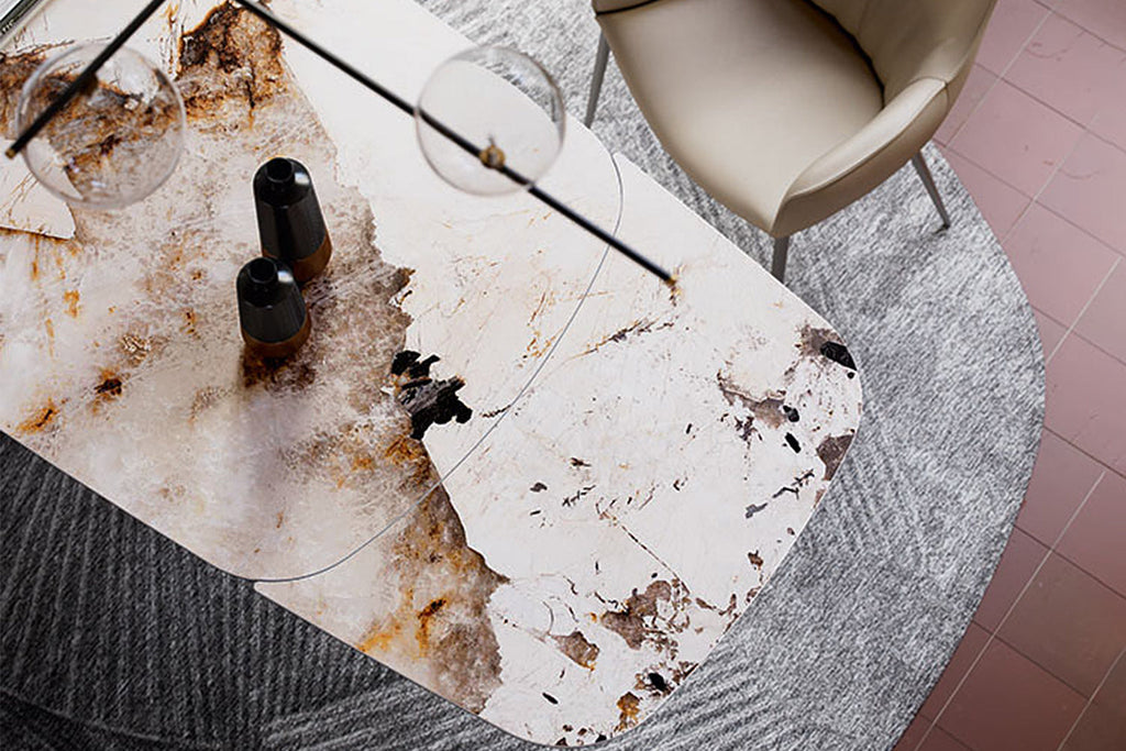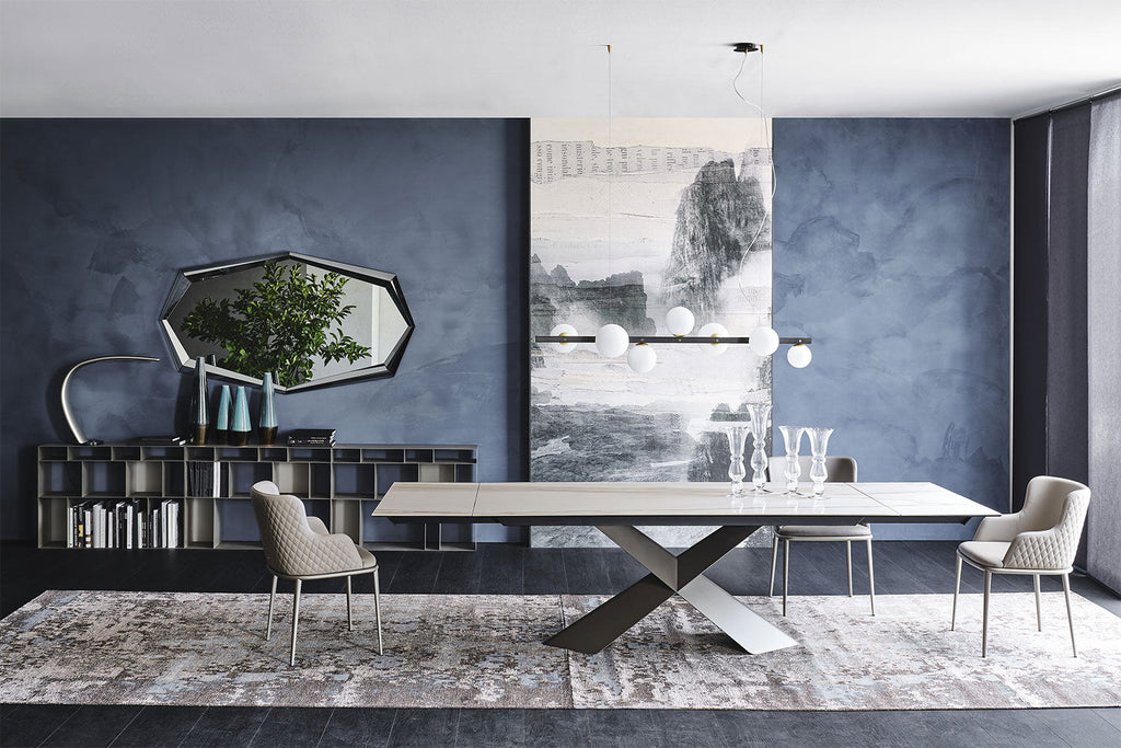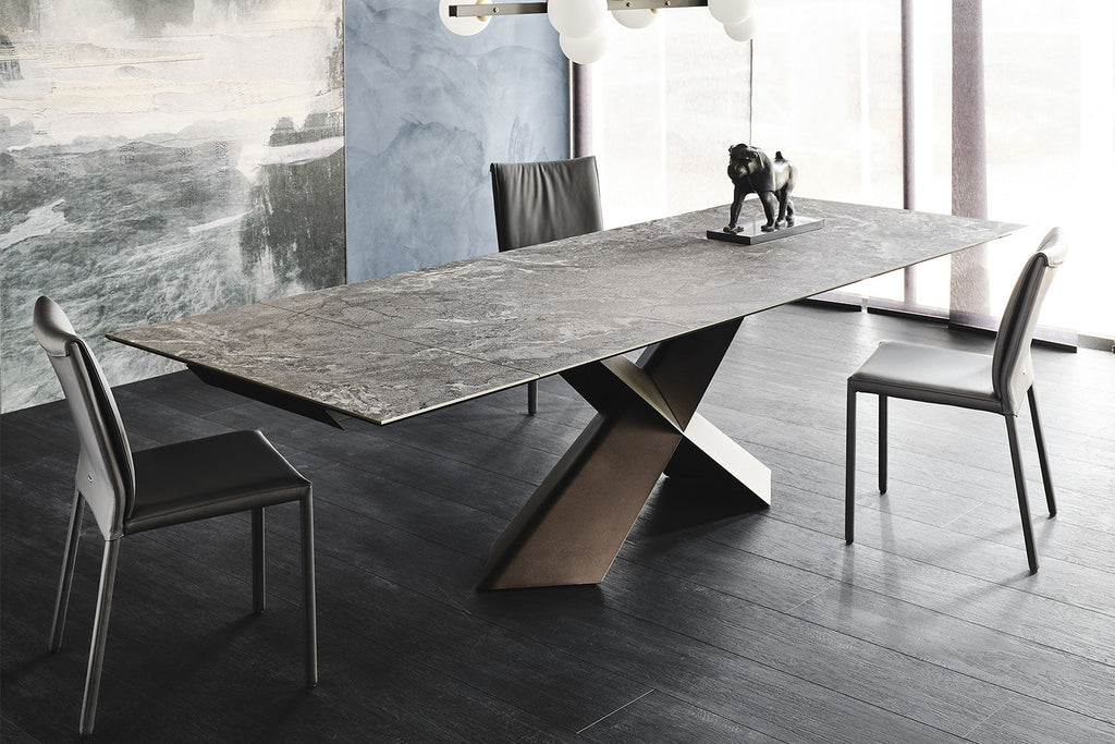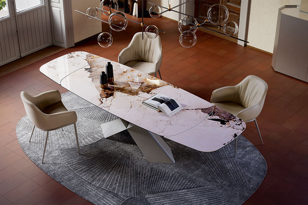 The Cattelan Italia Tyron Keramik Drive Barrel-Shaped Extendible Dining Table 200→294×100×75h brings Italian innovation and organic elegance to your dining space, seamlessly adapting from everyday meals to special occasions. Its sensuous barrel-shaped ceramic top expands smoothly from 200 cm to a generous 294 cm, allowing you to seat 8 guests when closed and up to 12 when fully extended. The unique curved surface is available in a selection of luxurious marble-effect ceramics, while the signature intersecting metal base offered in a range of sophisticated finishes—anchors the table with modern sculptural flair. Engineered for durability, stability, and effortless maintenance, the Tyron Keramik Drive Barrel-Shaped table is the ultimate centrepiece for those who love to entertain in style.