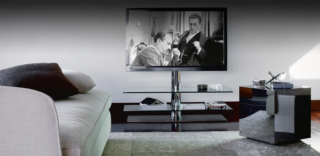 The Vision TV stand is an elegant, modern solution designed for both style and function. Its central chromed steel column supports a swiveling mount, allowing a TV to pivot for perfect viewing from anywhere in the room. Transparent tempered glass shelves add a sense of lightness and display space, while the base in satin stainless steel delivers refined stability. A built-in cable cover ensures the essential lines of the design are kept clean, supporting both aesthetics and practicality. Ideal for contemporary living rooms seeking flexibility and visual impact.