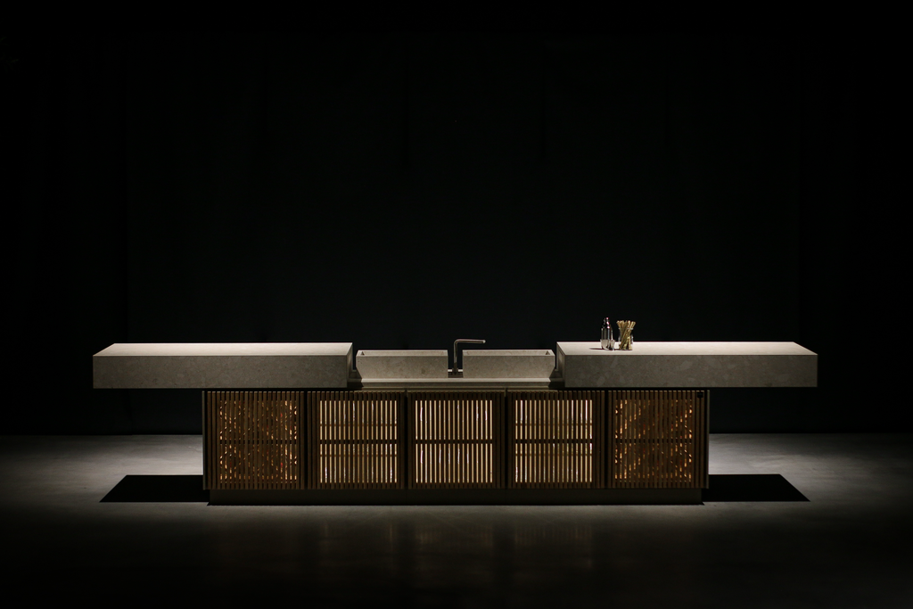 - Floating worktop that slides open to reveal two sinks for ice, washing glasses
