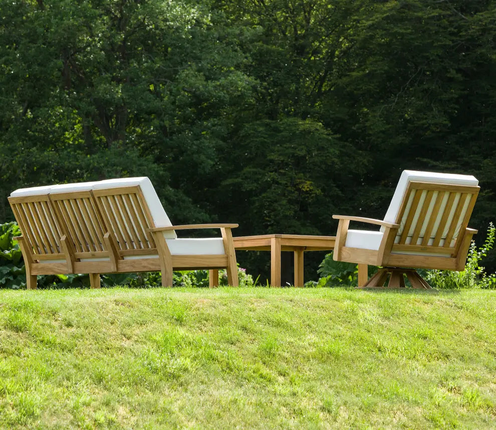 Coordinated Look: Matching teak and fabrics keep swivel rockers visually aligned with the wider Haven collection.