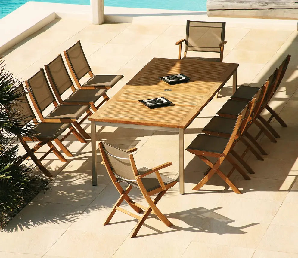 The Horizon Carver Chair is backed by Barlow Tyrie's comprehensive teak and sling warranty, ensuring lasting performance at your dining table.