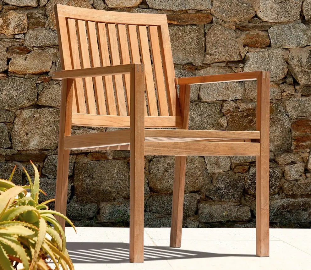 Introducing the Linear Carver, the commanding head-chair from Barlow Tyrie's Linear Dining collection featuring distinctive vertical slats and signature decorative arm joint. This premium all-teak carver delivers executive presence with 58 cm width and substantial 9 kg construction for formal outdoor dining.