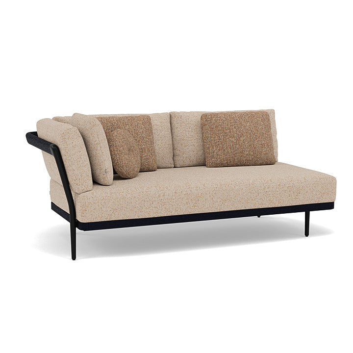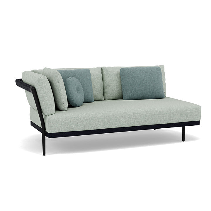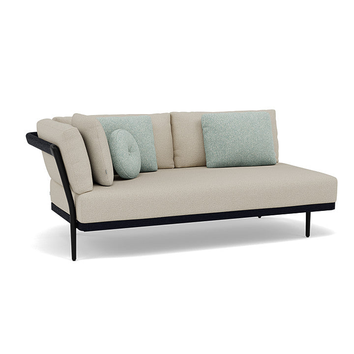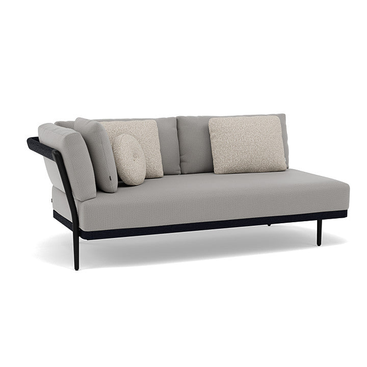 Lightweight yet robust powder-coated aluminium frame resists corrosion, UV degradation, and salt air. Available in warm-grey Flint or deep Black, the frame delivers clean architectural lines with integrated armrest detailing that visually anchors the right end of any Flows sectional configuration.