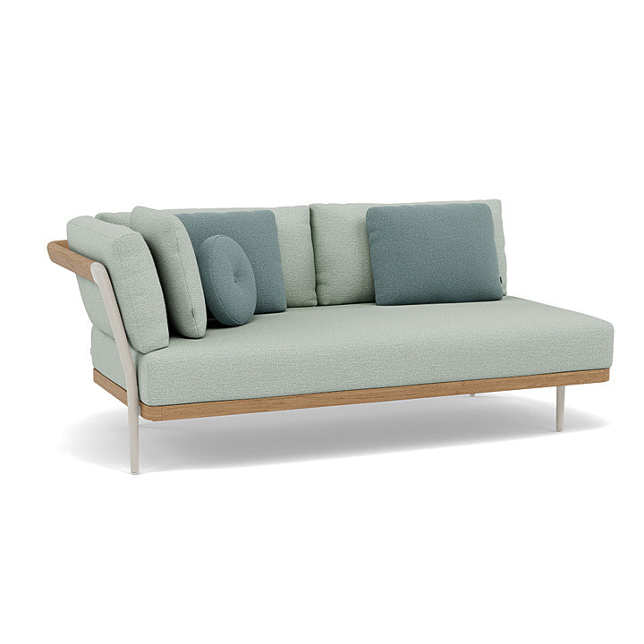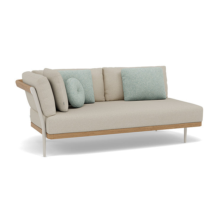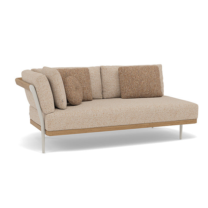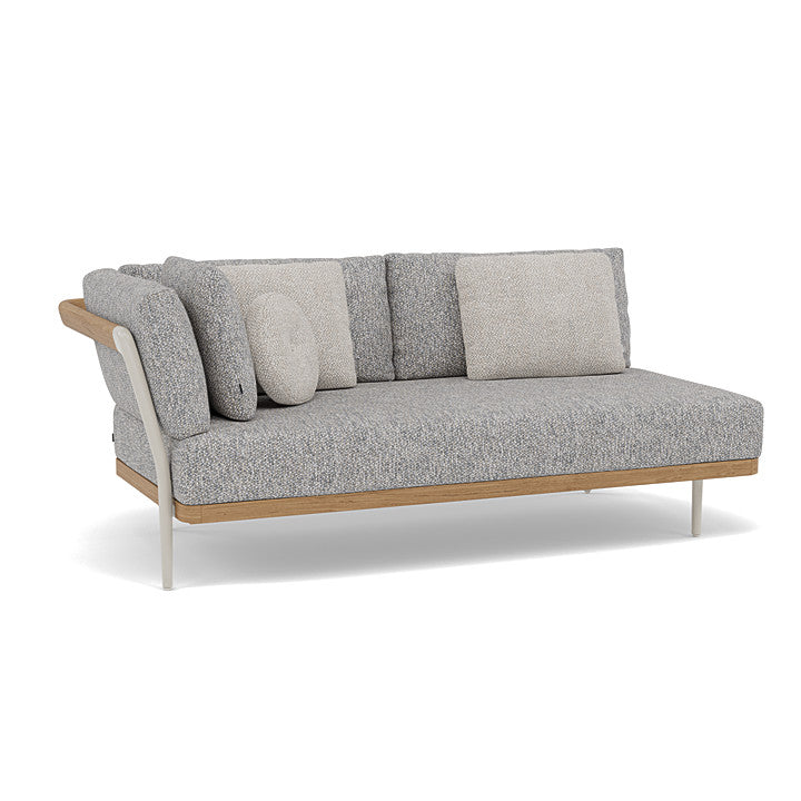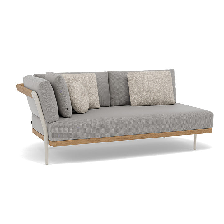 - Right-Hand Directional Corner Module: Specifically engineered as the right-terminating end unit for Flows sectional configurations, incorporating a full teak armrest on the outer right edge and enclosed backrest support that gracefully closes off any L-shaped or U-shaped arrangement.