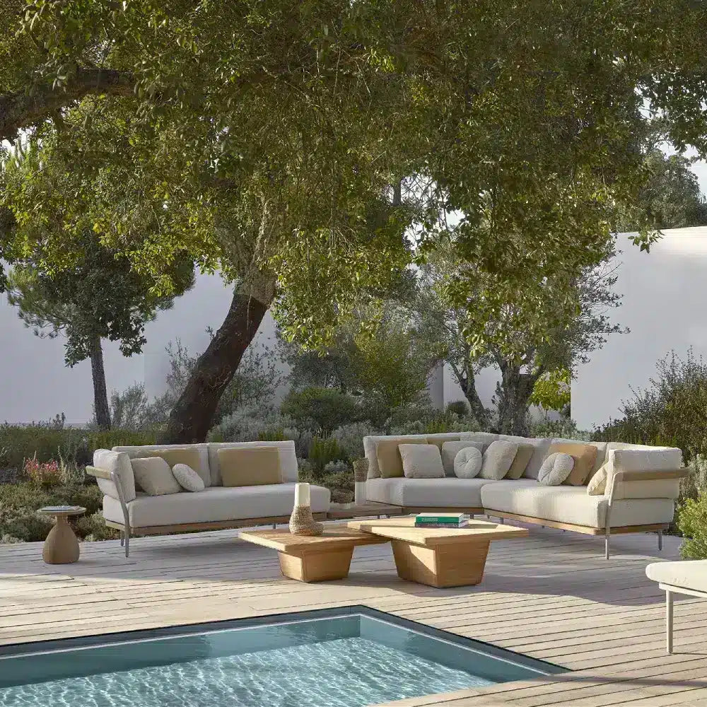 Soft warm-grey Flint aluminium paired with honey-toned Teak Natural creates a refined, inviting corner anchor ideal for coastal, Mediterranean, and resort-style outdoor sectional settings.