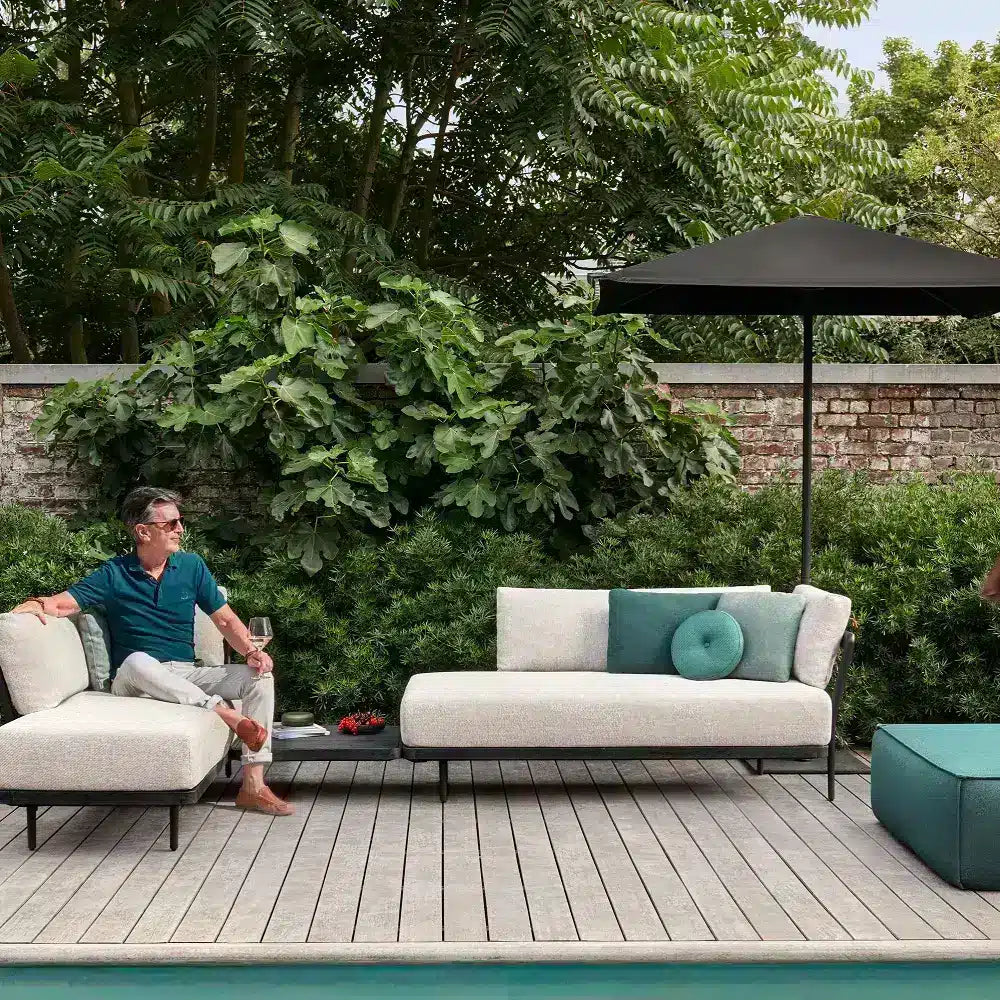 Belgian Craftsmanship & Design Excellence: The Flows Right Corner Double Seat reflects Manutti's precision approach to modular outdoor design — every connector, armrest detail, and cushion layer is engineered to align flawlessly with all other Flows modules. At 176 cm wide, this directional corner end unit anchors the right termination of any sectional with structural elegance, available in two refined frame combinations and 9 curated cushion palettes for residential terraces, luxury resorts, boutique hotels, and yacht decks worldwide.