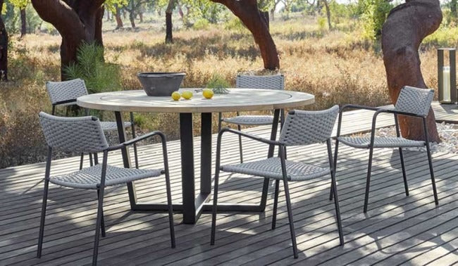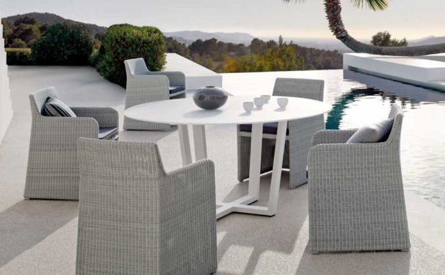 The Manutti Fuse Round Dining Table 125 cm delivers refined, minimalist design tailored for smaller outdoor dining areas. With its sculptural base in Lava and a choice of ceramic tabletops—including the striking Marble Black or the natural-toned Travertin Geo—this table brings enduring elegance to terraces, balconies, and patios.