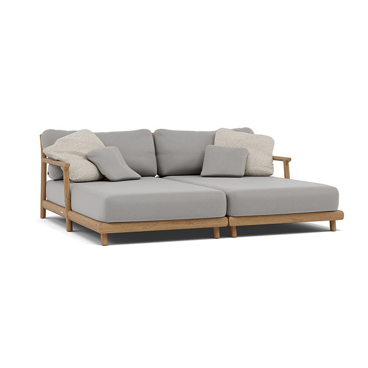 Handcrafted from solid natural teak with soft, rounded joints creating seamless organic silhouette. Natural teak oils provide inherent weather resistance and timeless warmth. Develops distinguished silver-grey patina over time or maintains honey-brown appearance with teak oil.